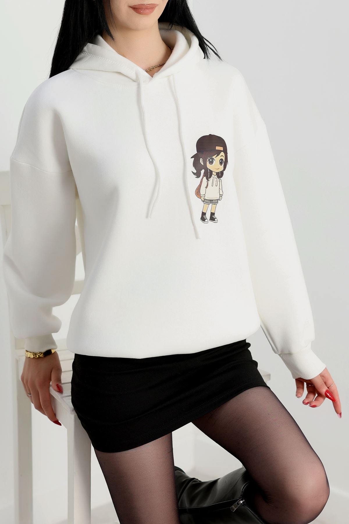 3 İplik Kapşonlu Baskılı Sweat Ekru - 42222.1878.