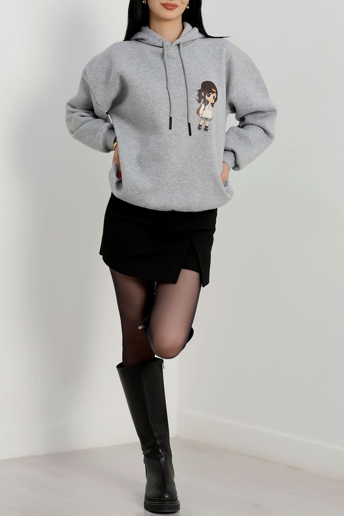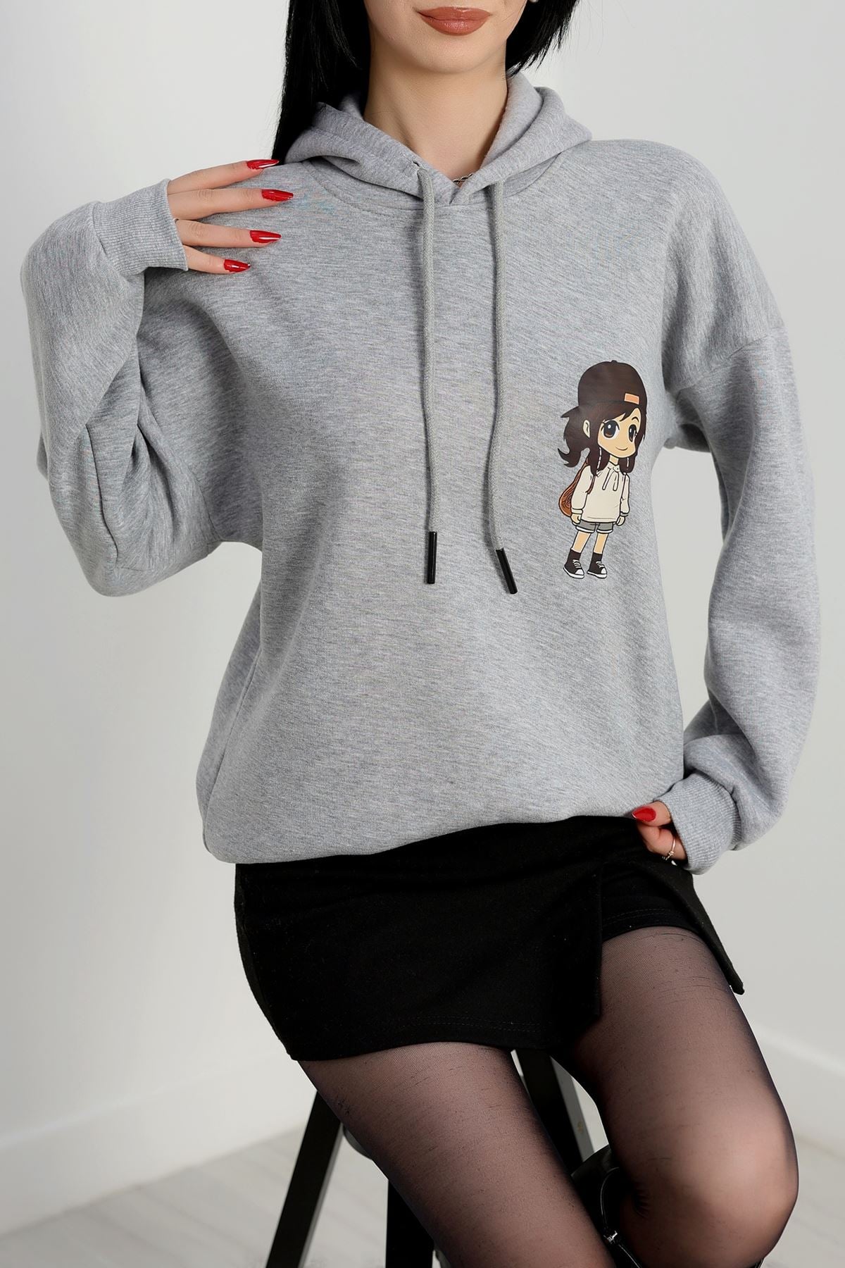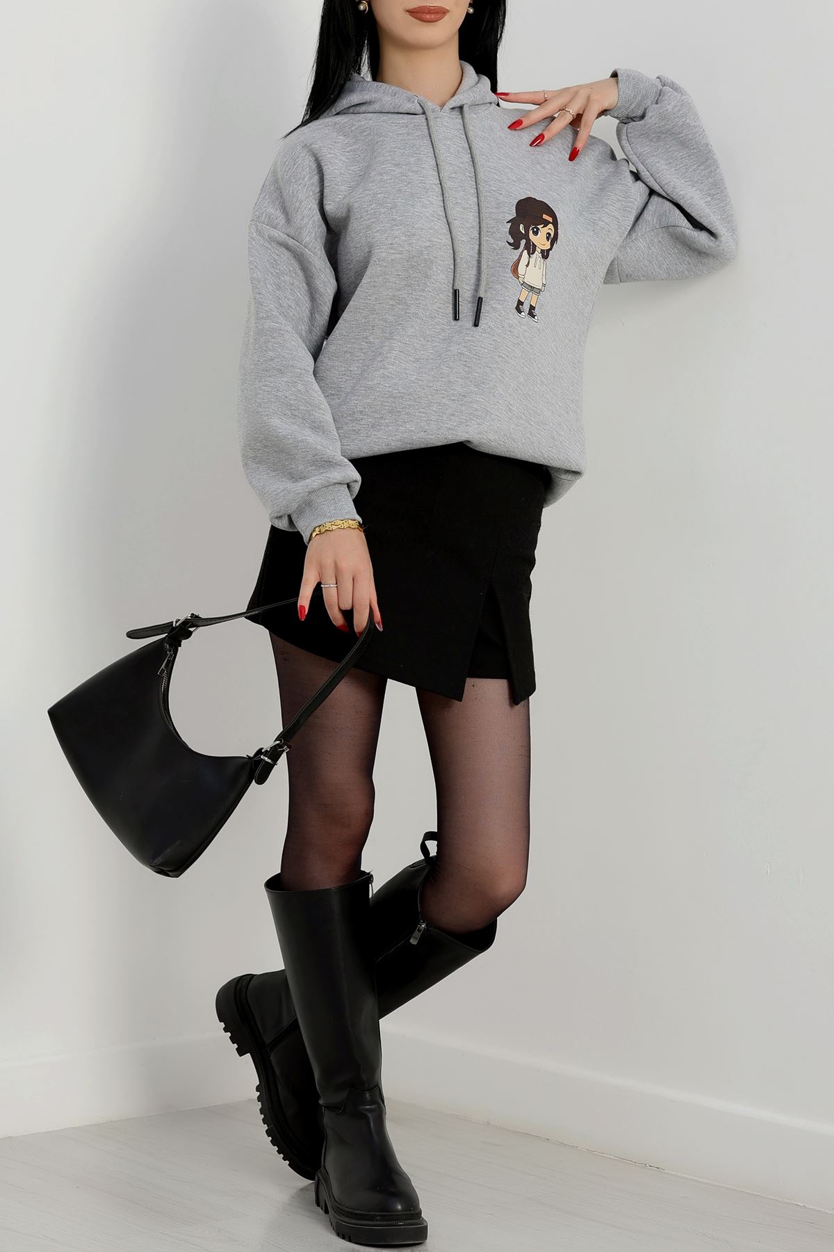3 İplik Kapşonlu Baskılı Sweat Gri - 42222.1878.