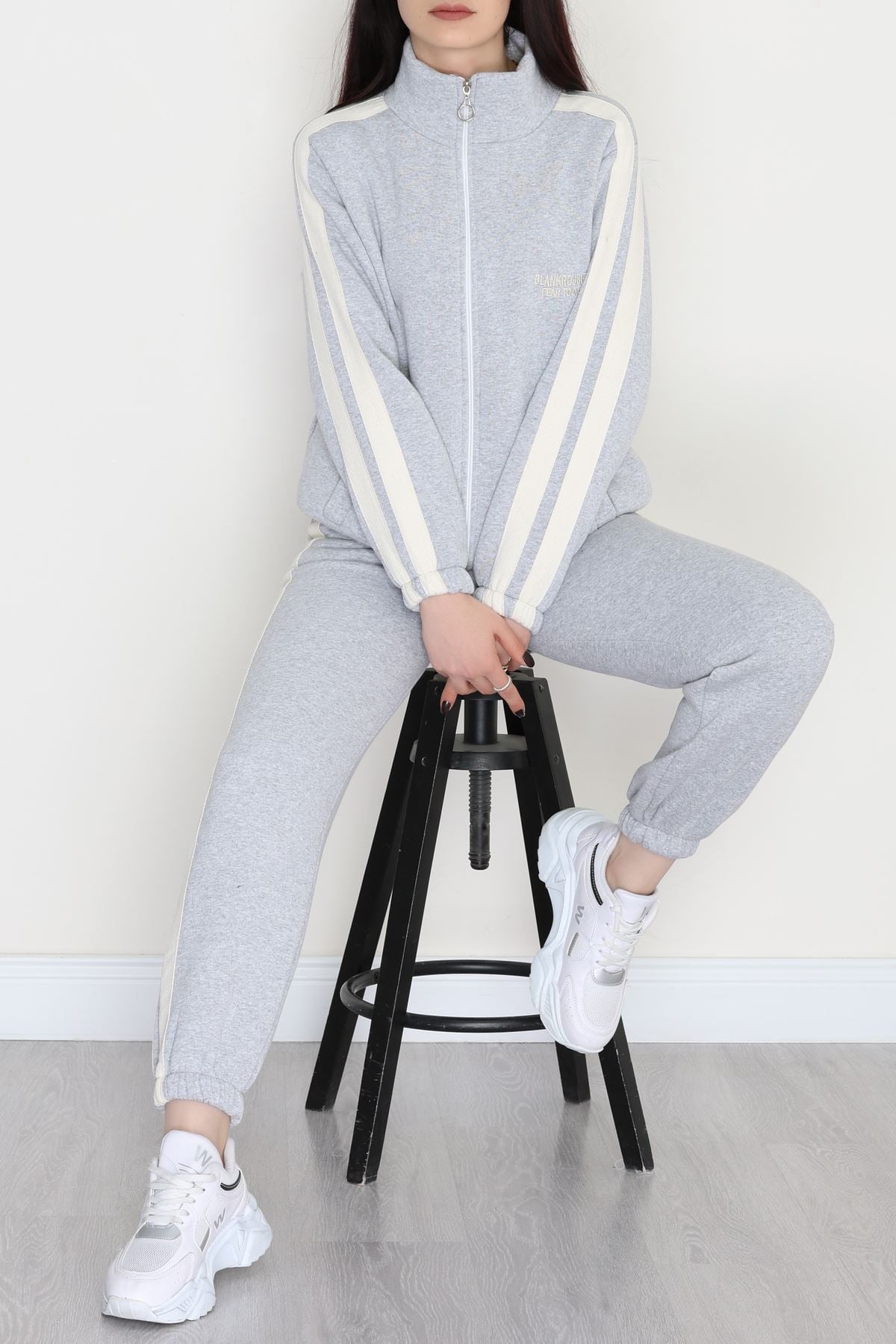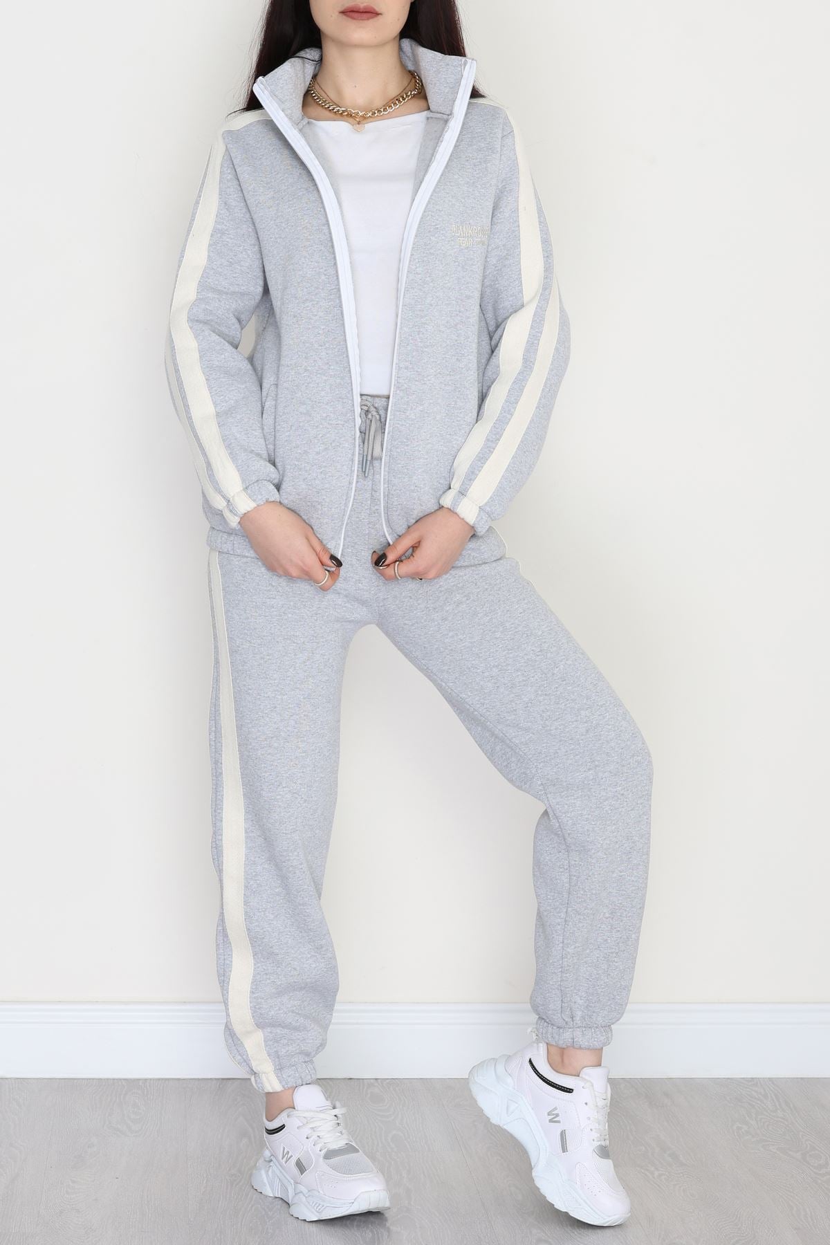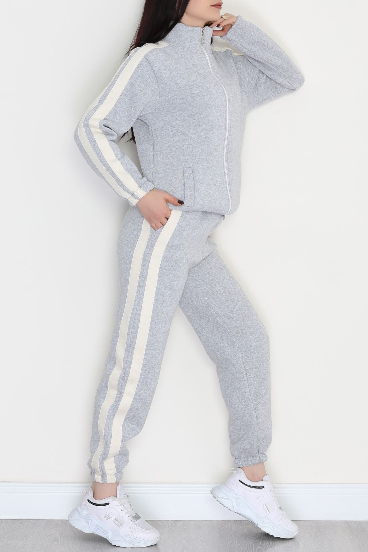 3 İplik Keten Şeritli Eşofman Takım Gri - 40017.1857.