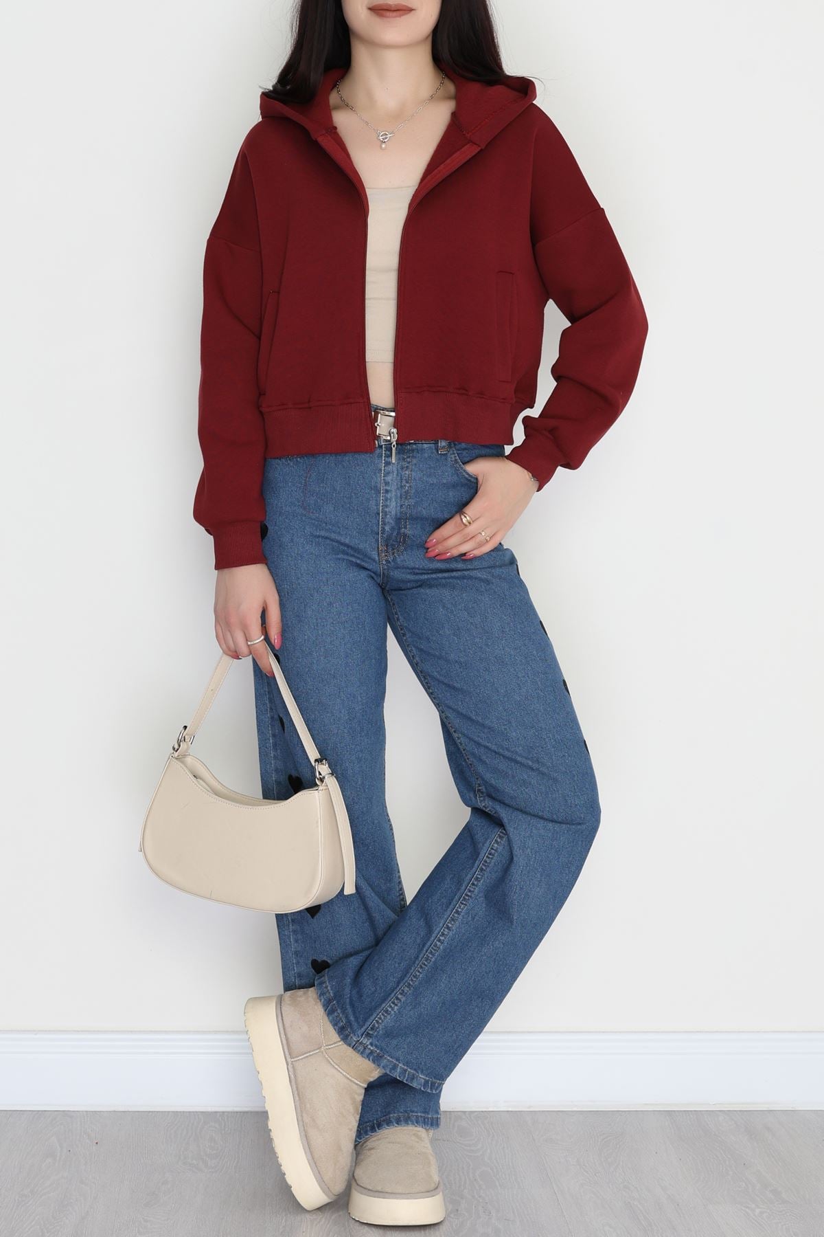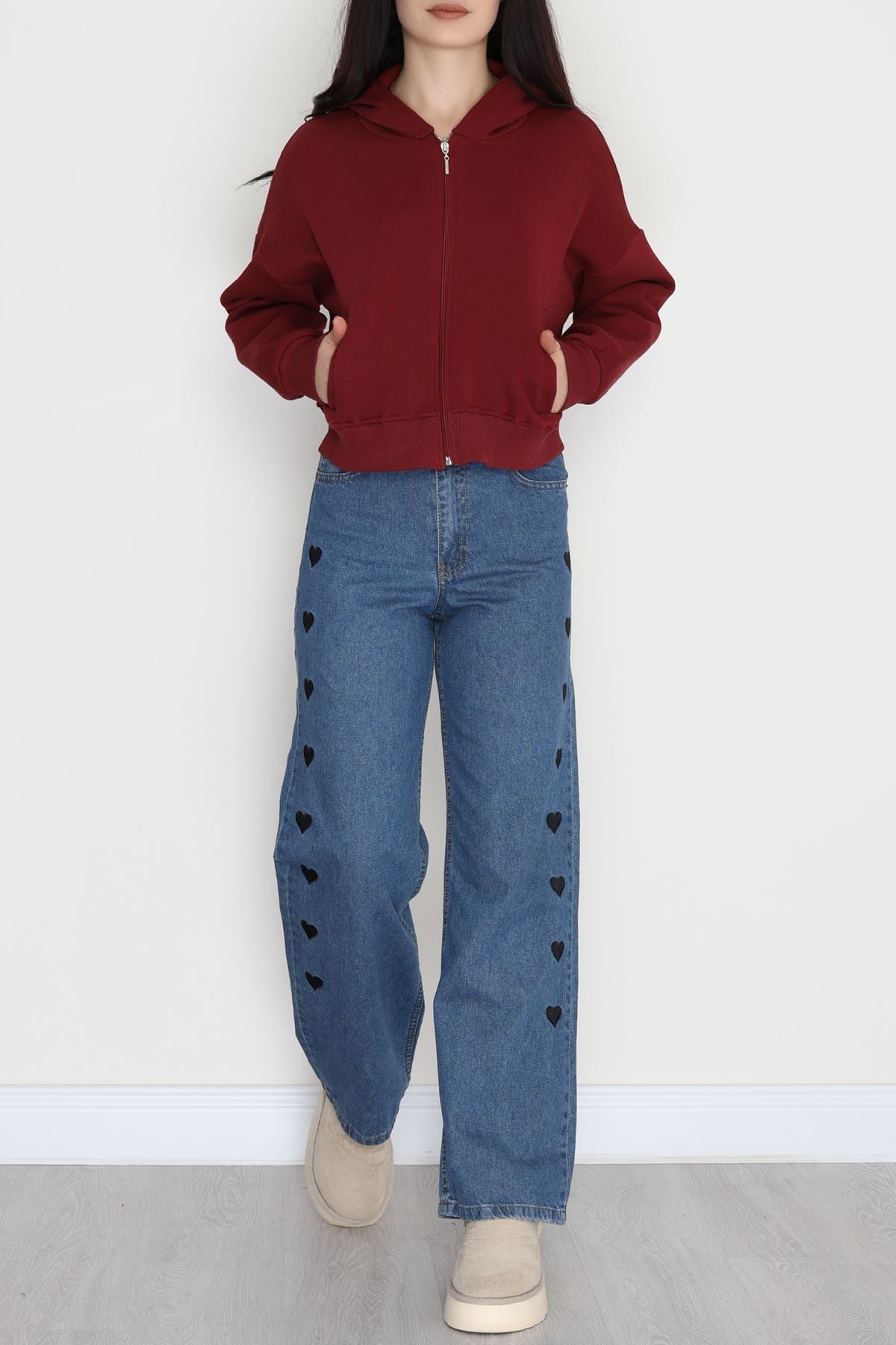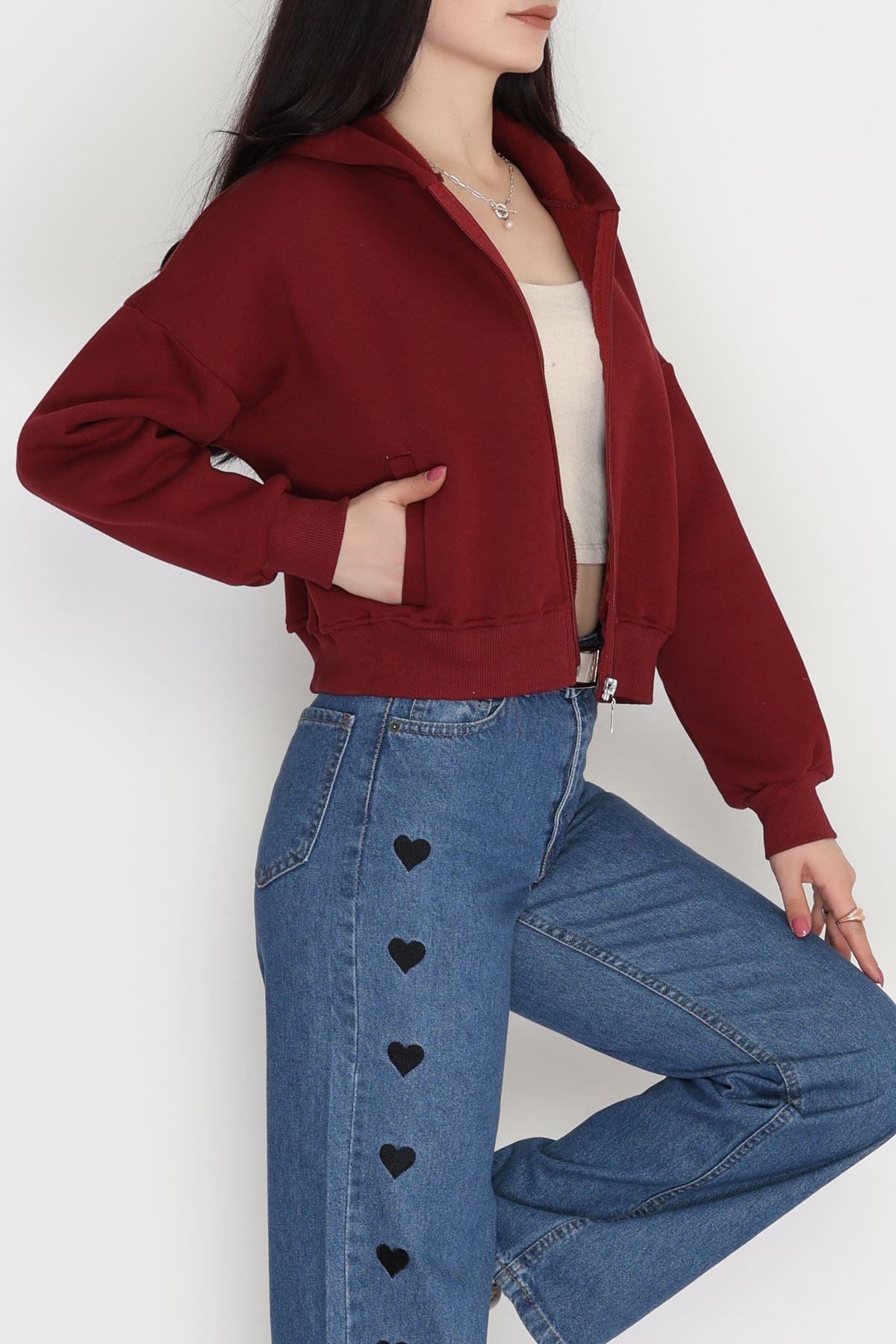 3 İplik Kompakt Oversize Fleto Cepli Sweat Bordo - 42506.1878.