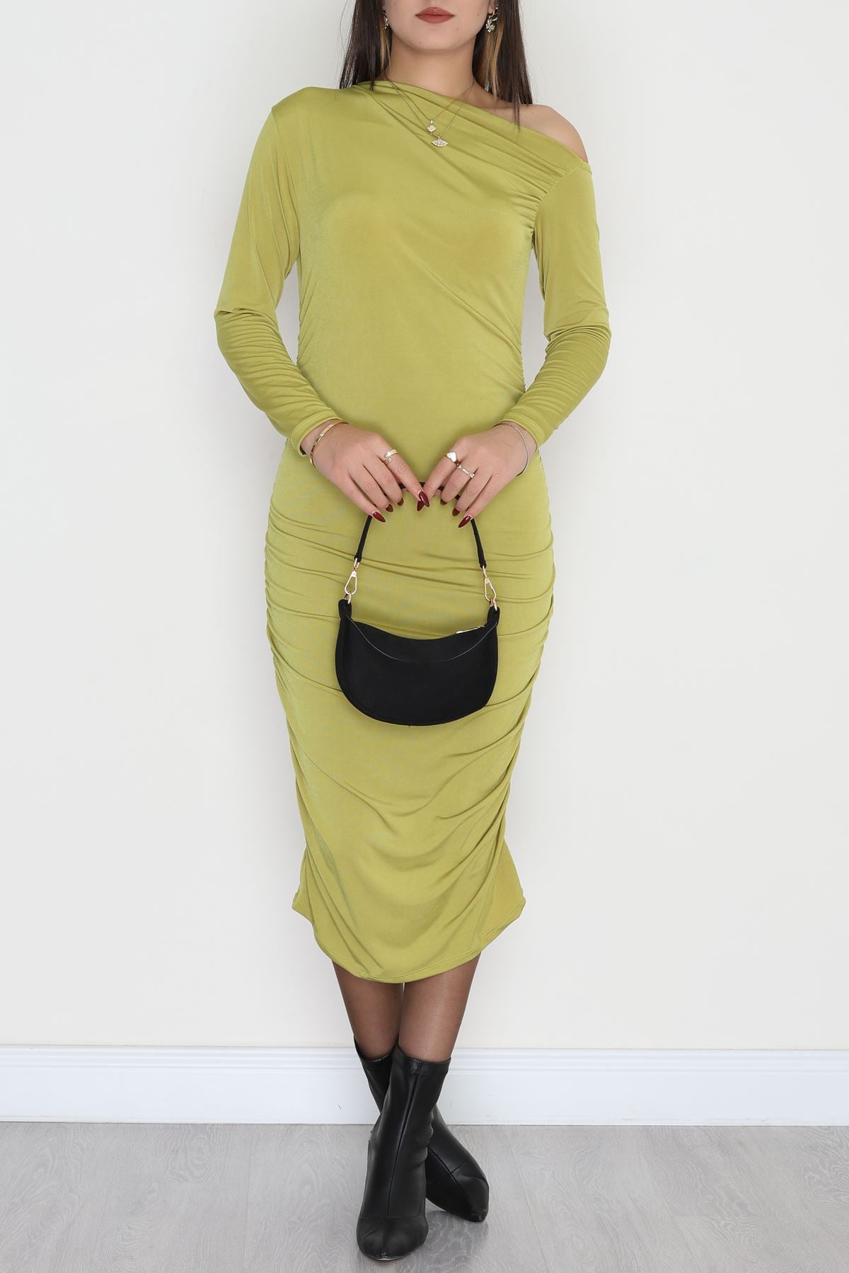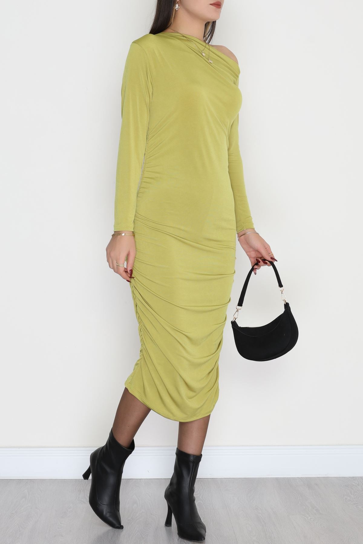 Asimetrik Yaka Sandy Elbise Yağyeşili - 42570.1949.