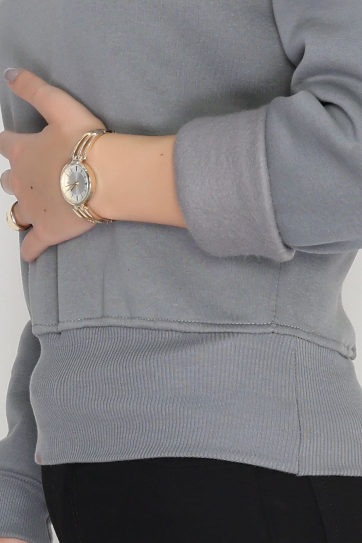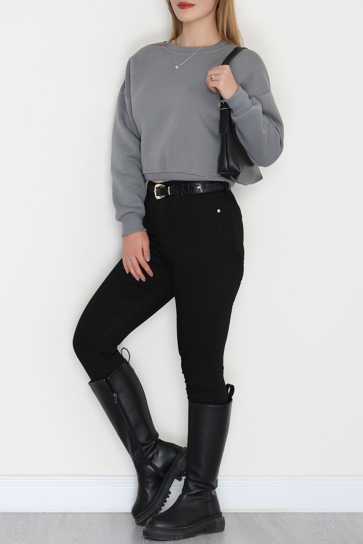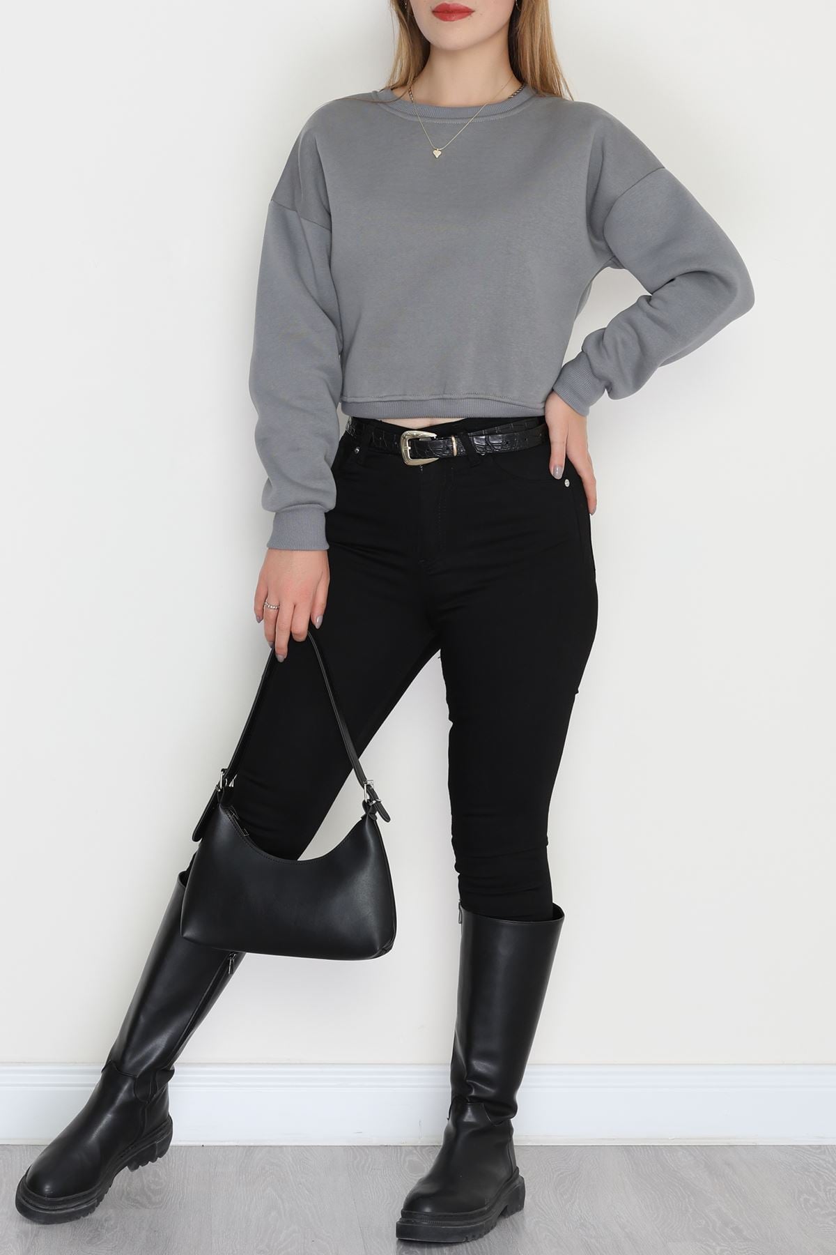 Bisiklet Yaka 3 İplik Crop Sweat Füme - 20968.1878.