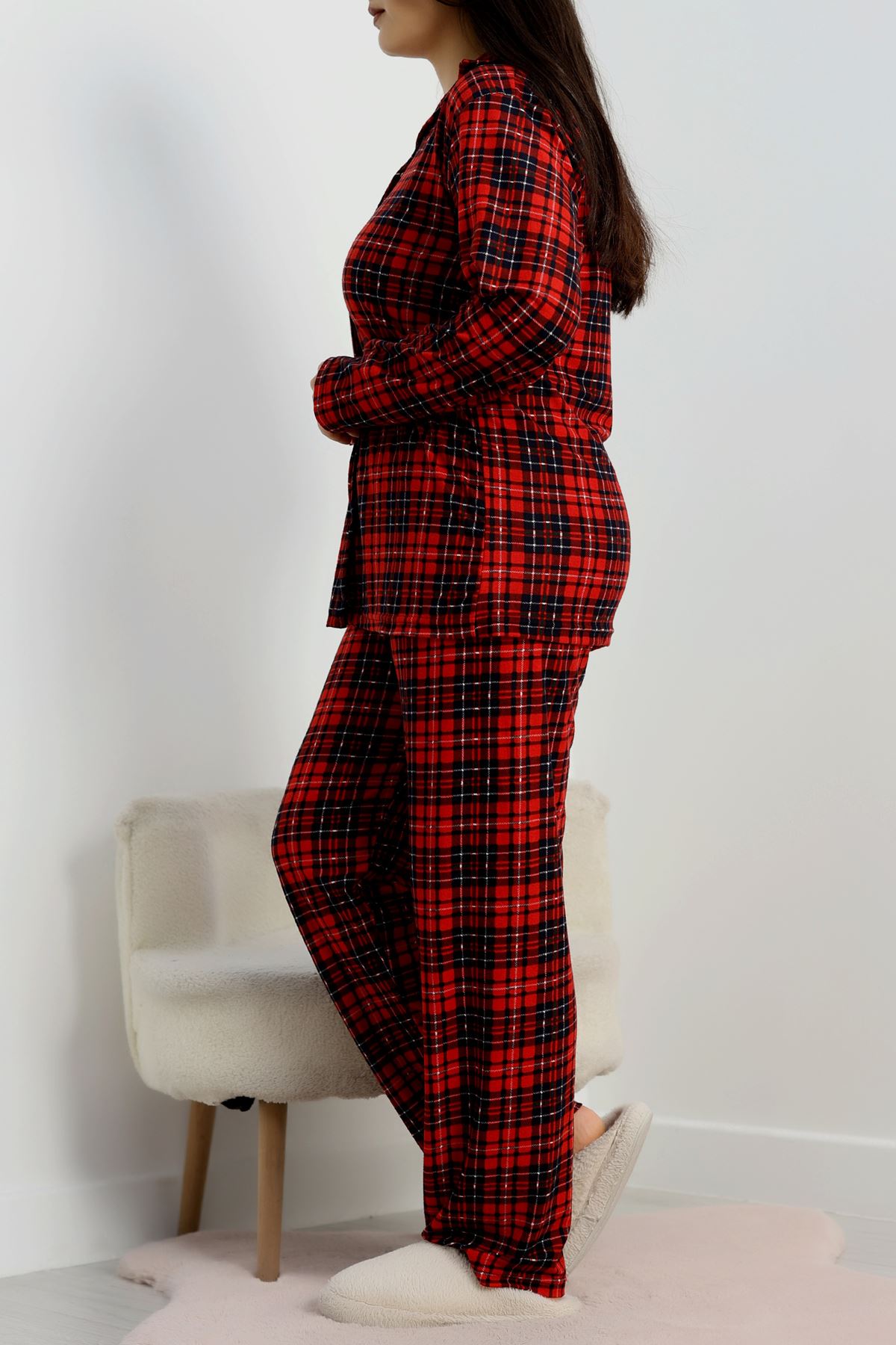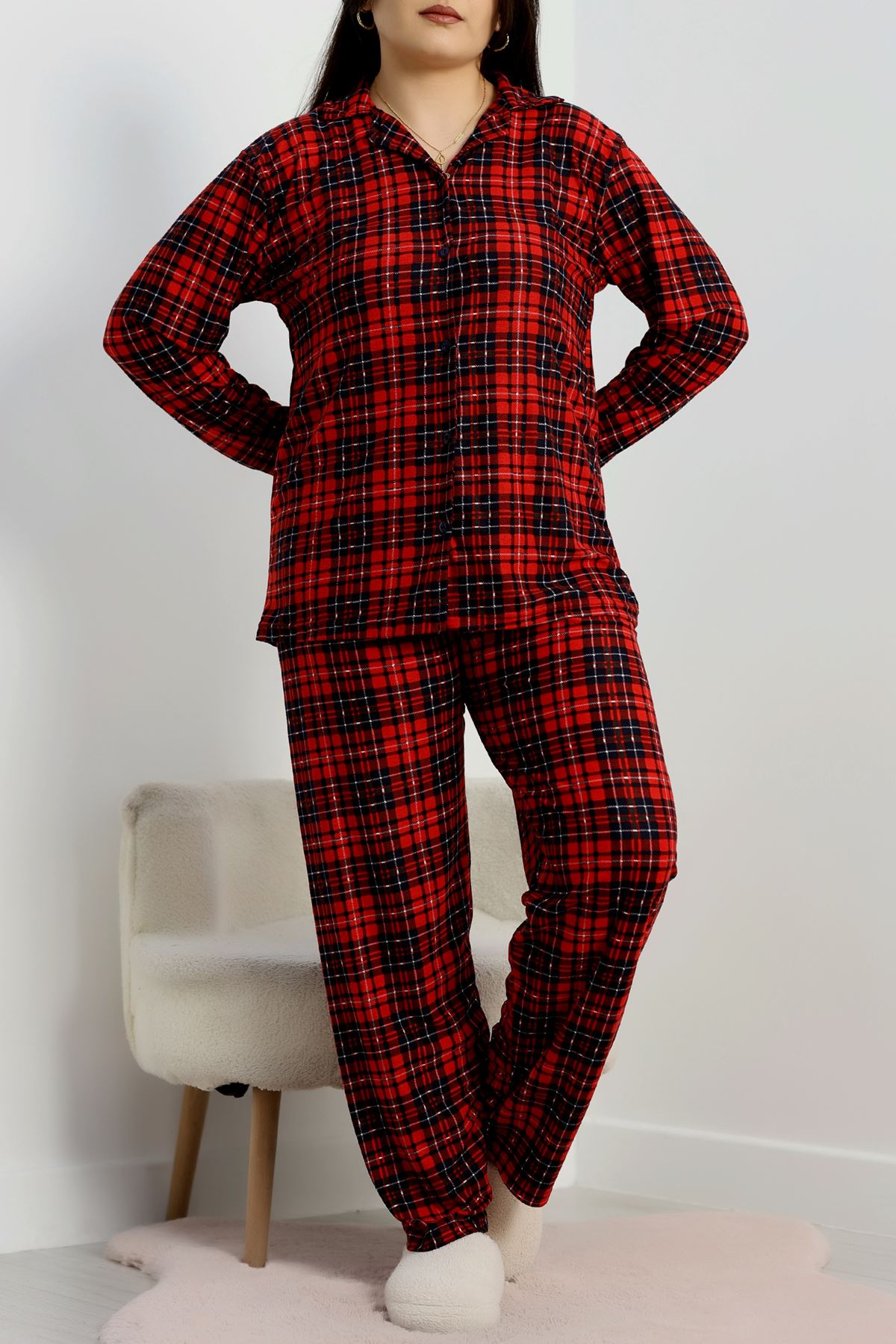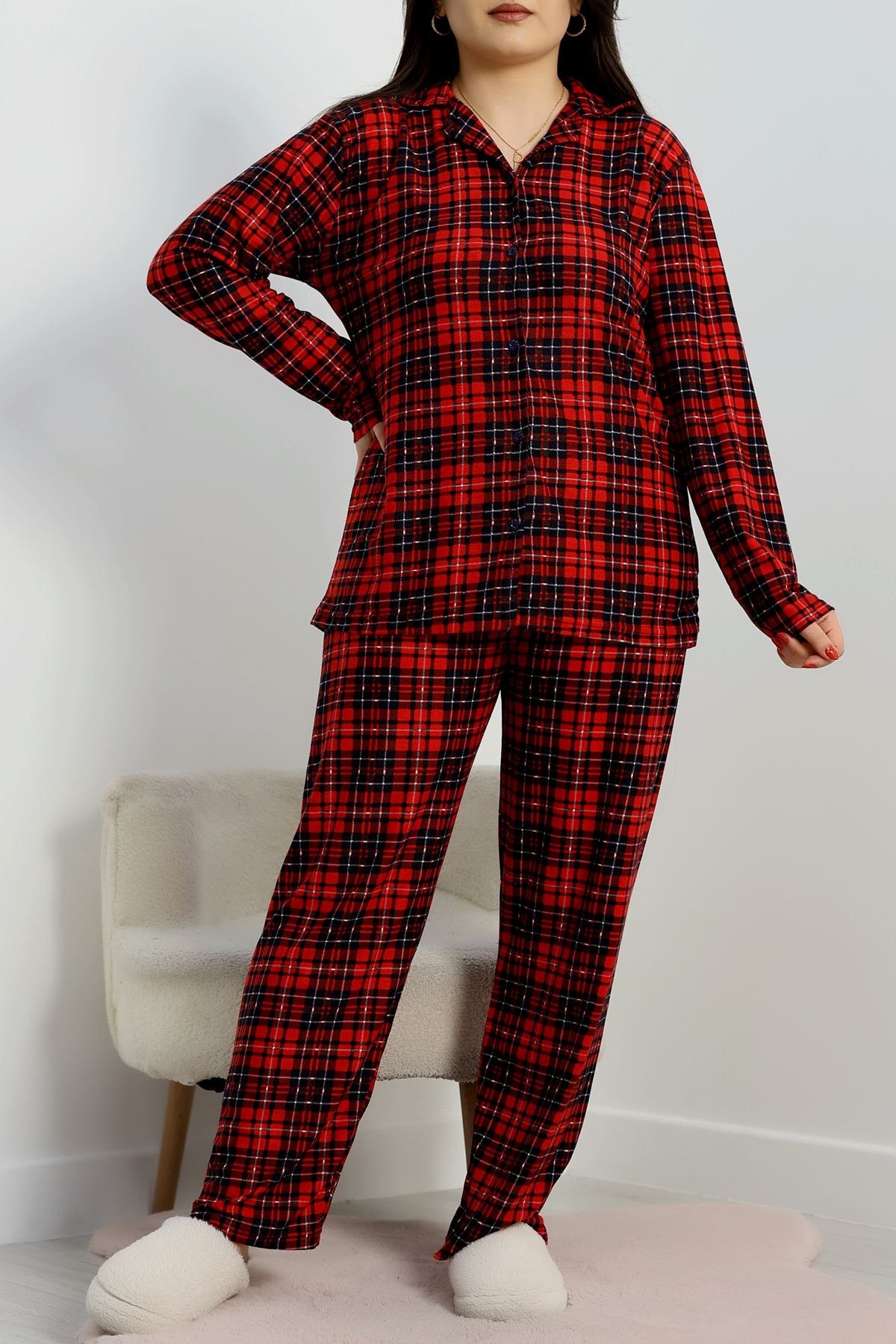 Büyük Beden Süet Düğmeli Pijama Takımı Kırmızıekose - 455.1287.