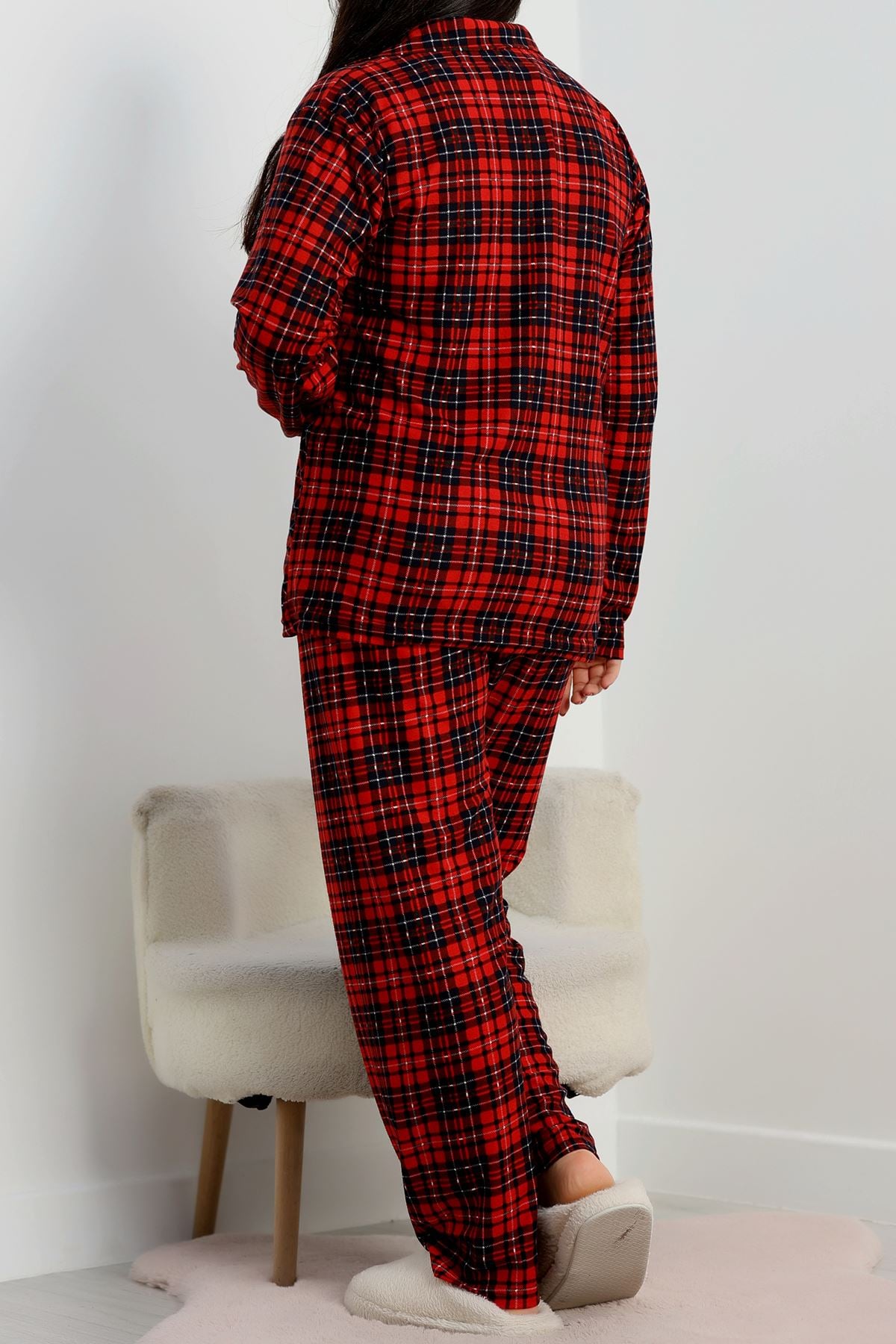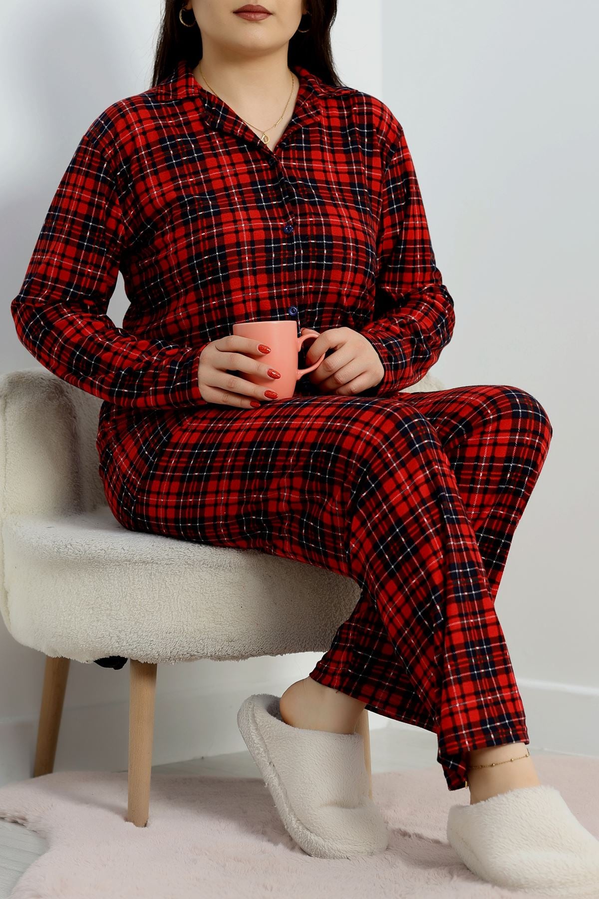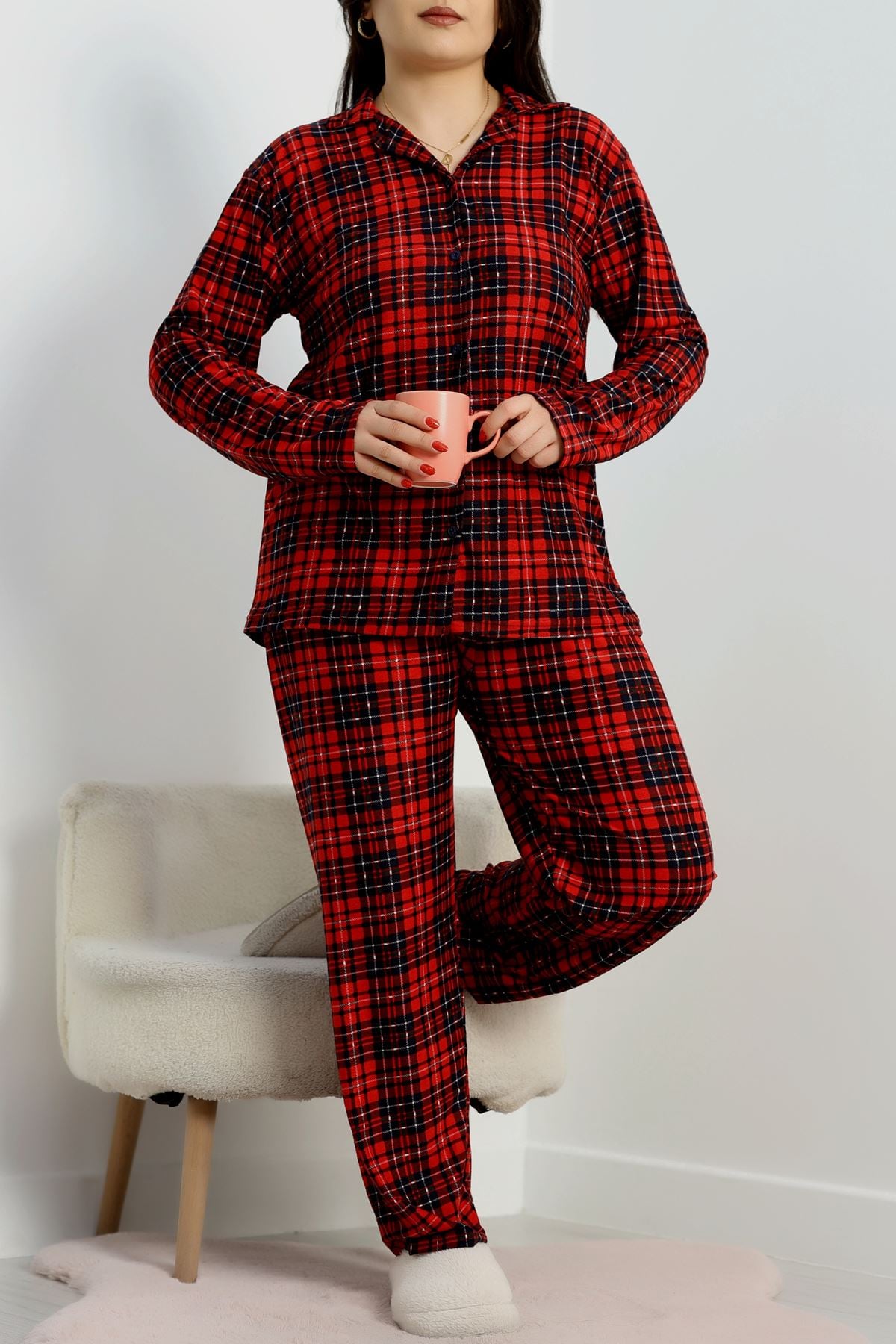 Büyük Beden Süet Düğmeli Pijama Takımı Kırmızıekose - 455.1287.