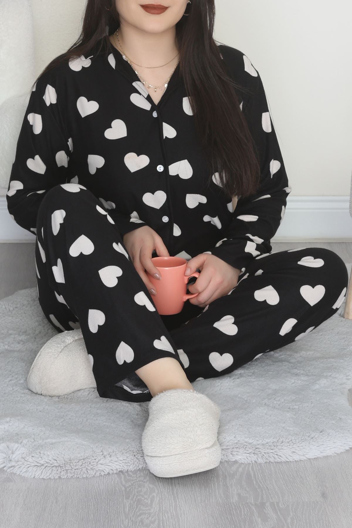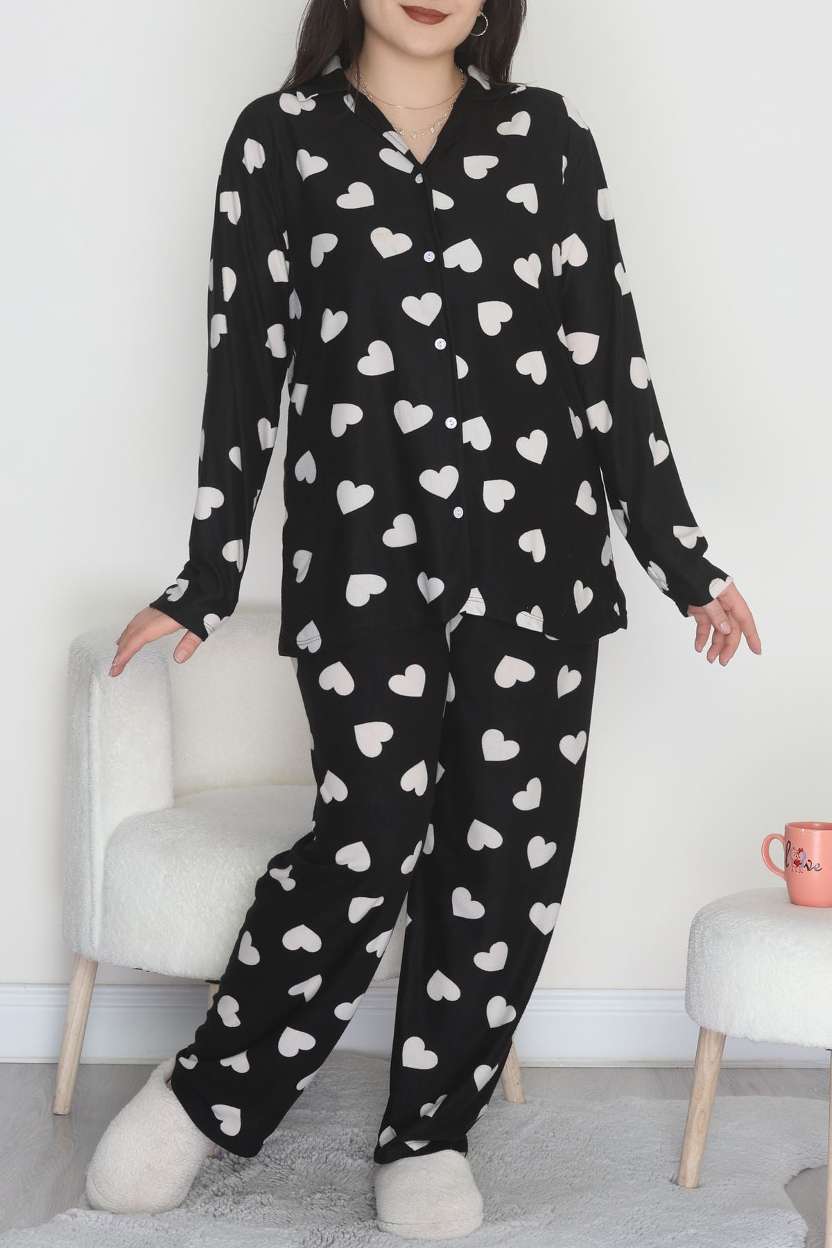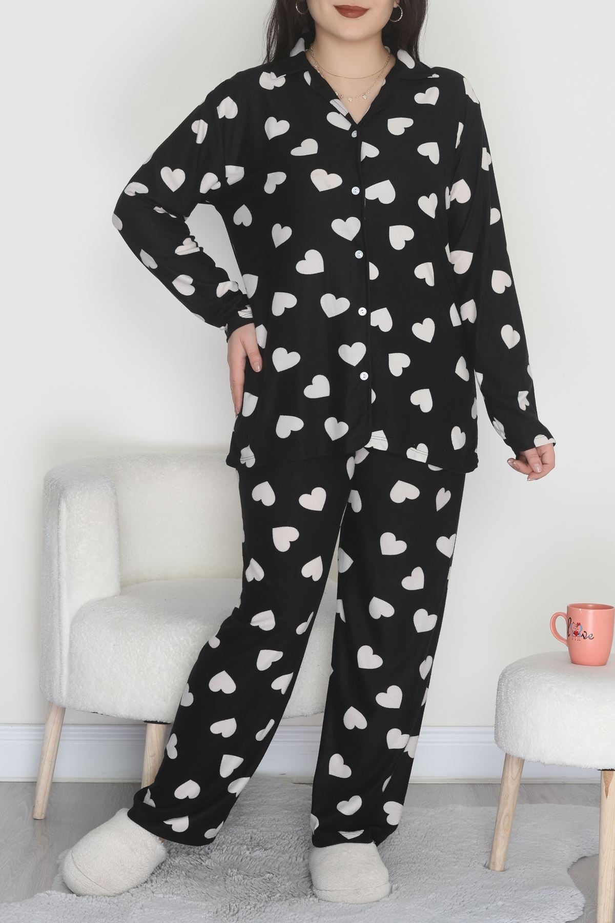 Büyük Beden Süet Düğmeli Pijama Takımı Siyahekru - 455.1287.