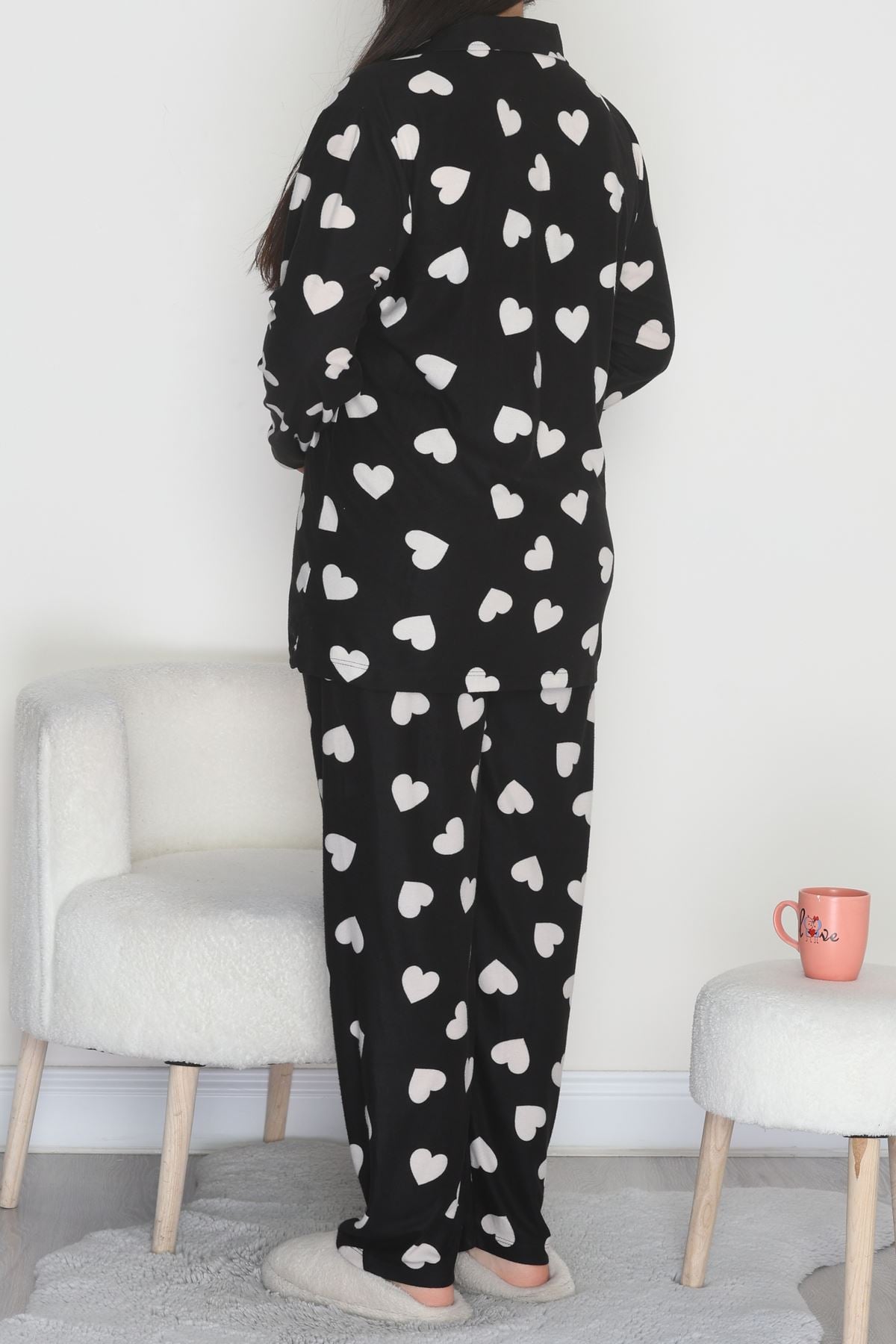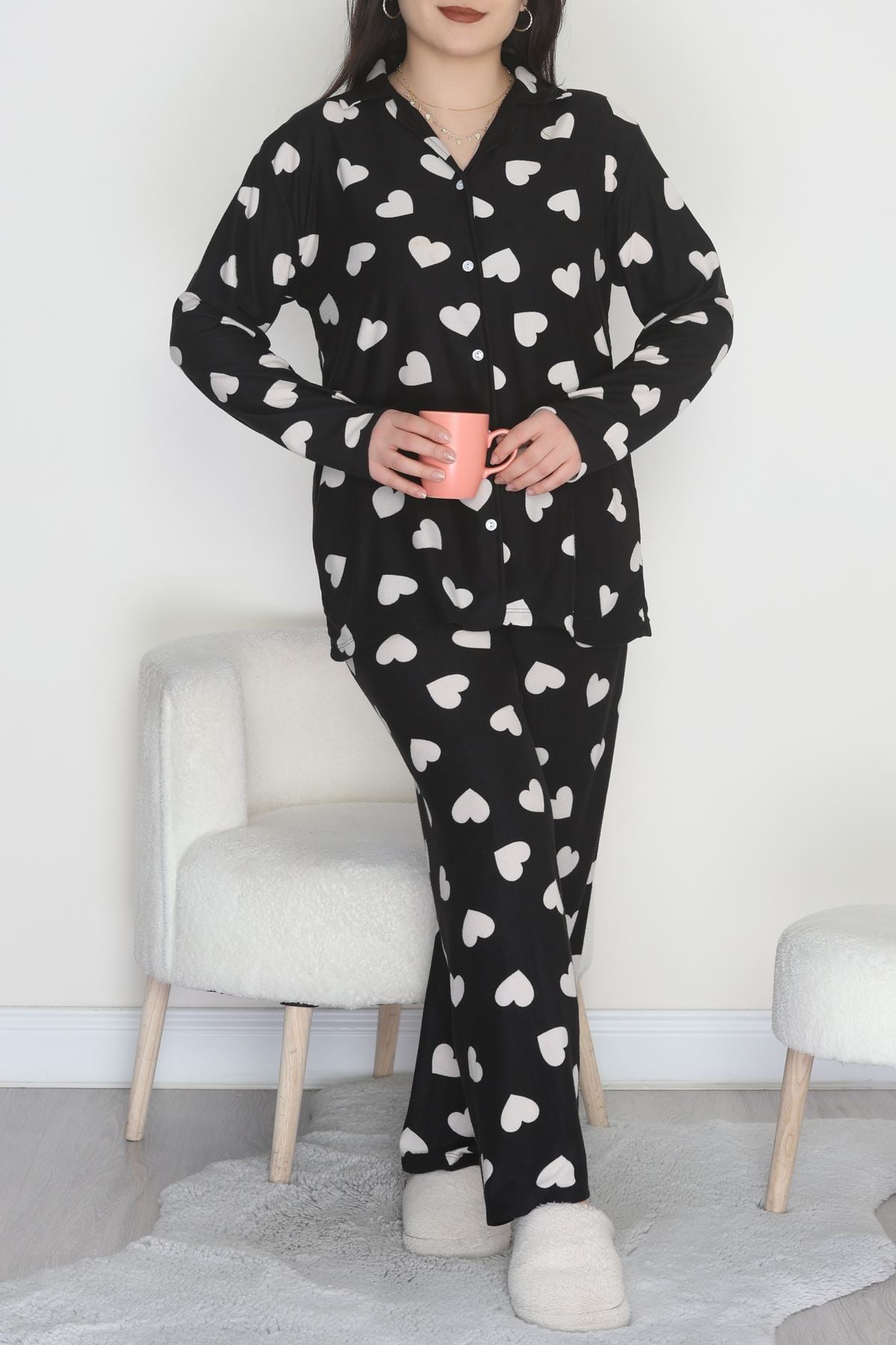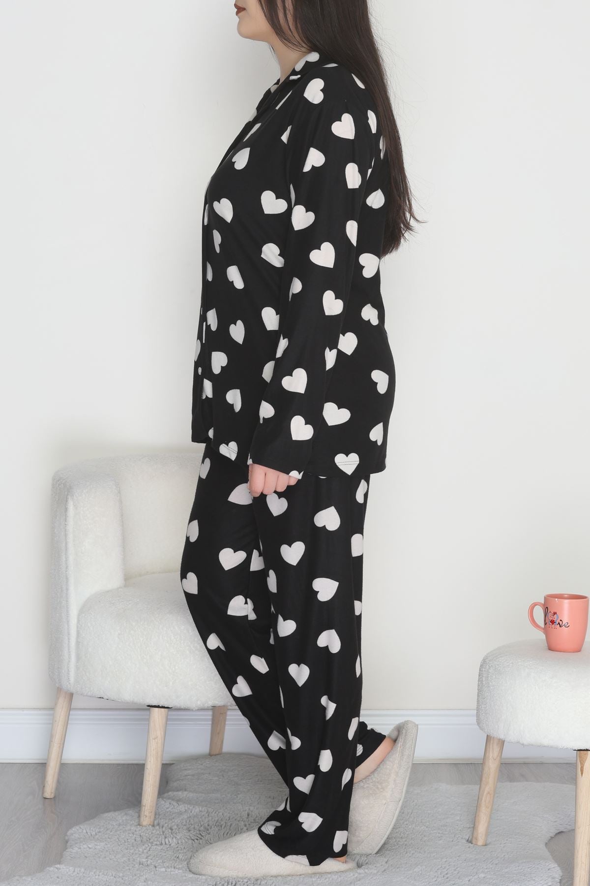 Büyük Beden Süet Düğmeli Pijama Takımı Siyahekru - 455.1287.