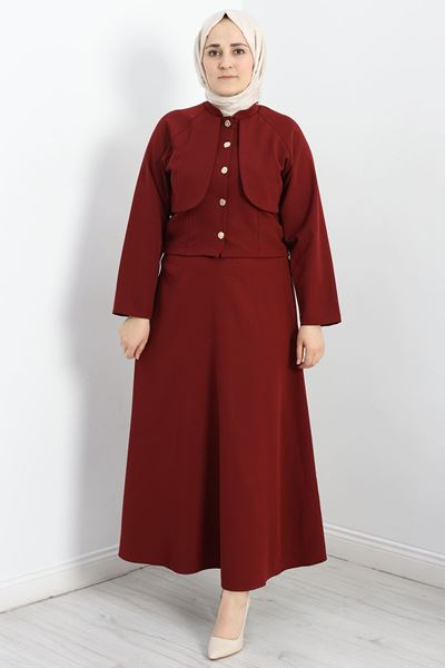 Ceketli Etekli Takım Şıklığı ve rahatlığı bir arada sunan bu takım, özel günlerinizde ve günlük kullanımda vazgeçilmeziniz olacak. Şimdi keşfedin! Ceketli Etekli Takım, zarif ve modern tasarımıyla dikkat çekiyor. Bordo rengiyle asil bir görünüm sunan bu takım, ceket ve etek olmak üzere iki parçadan oluşuyor. Ceket, şık düğme detaylarıyla hareketlendirilirken, etek ise rahat kesimiyle gün boyu konfor sağlıyor. Hem özel davetlerde hem de günlük şıklığınızı tamamlamak için ideal bir seçim. Gardırobunuzun vazgeçilmez parçası olmaya aday.