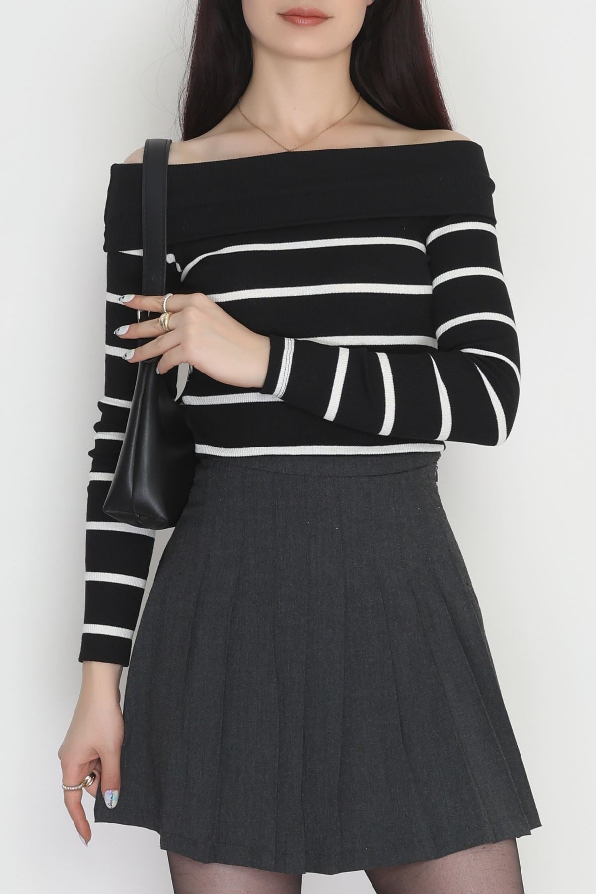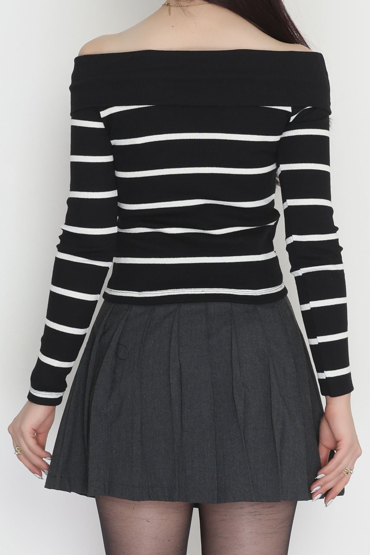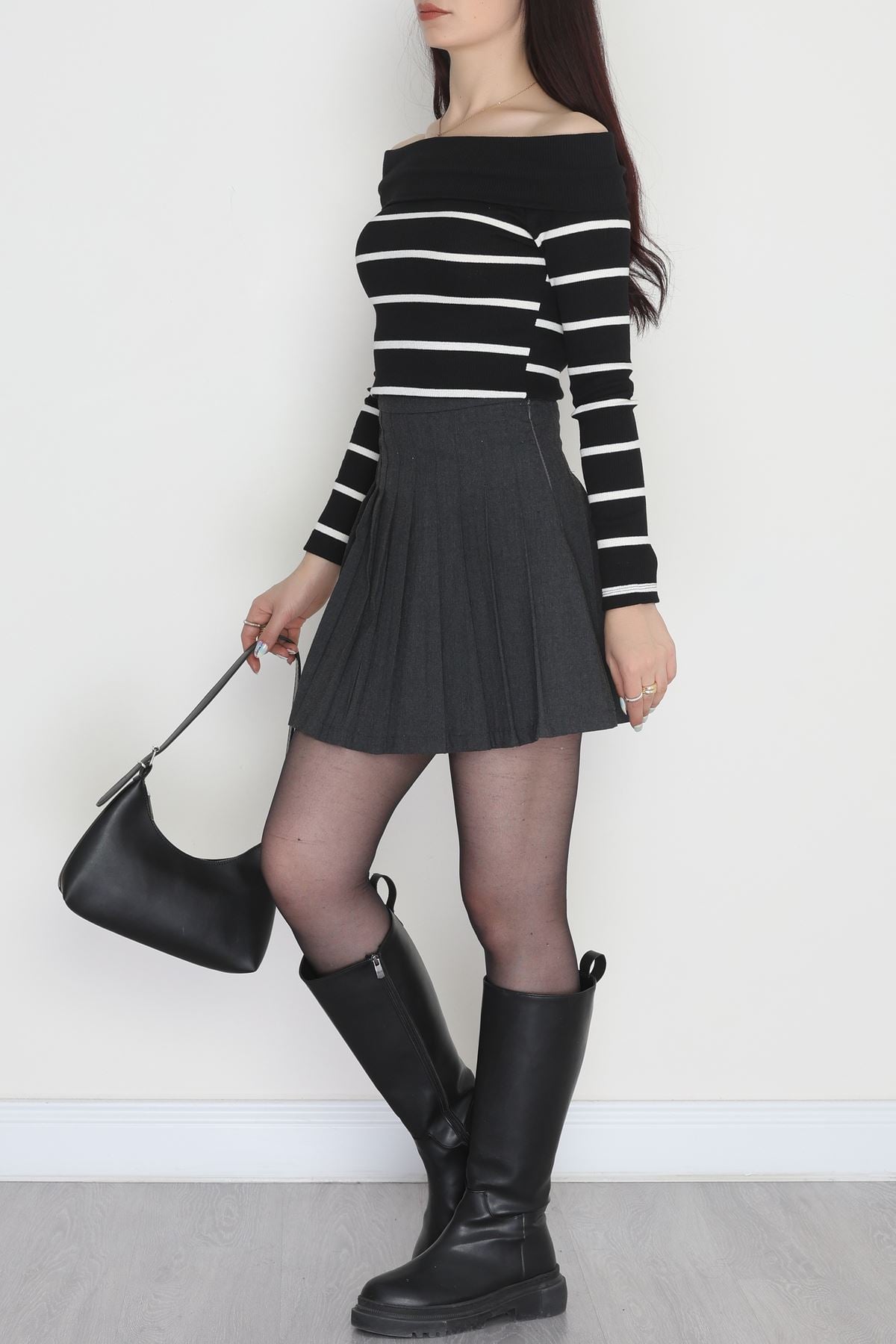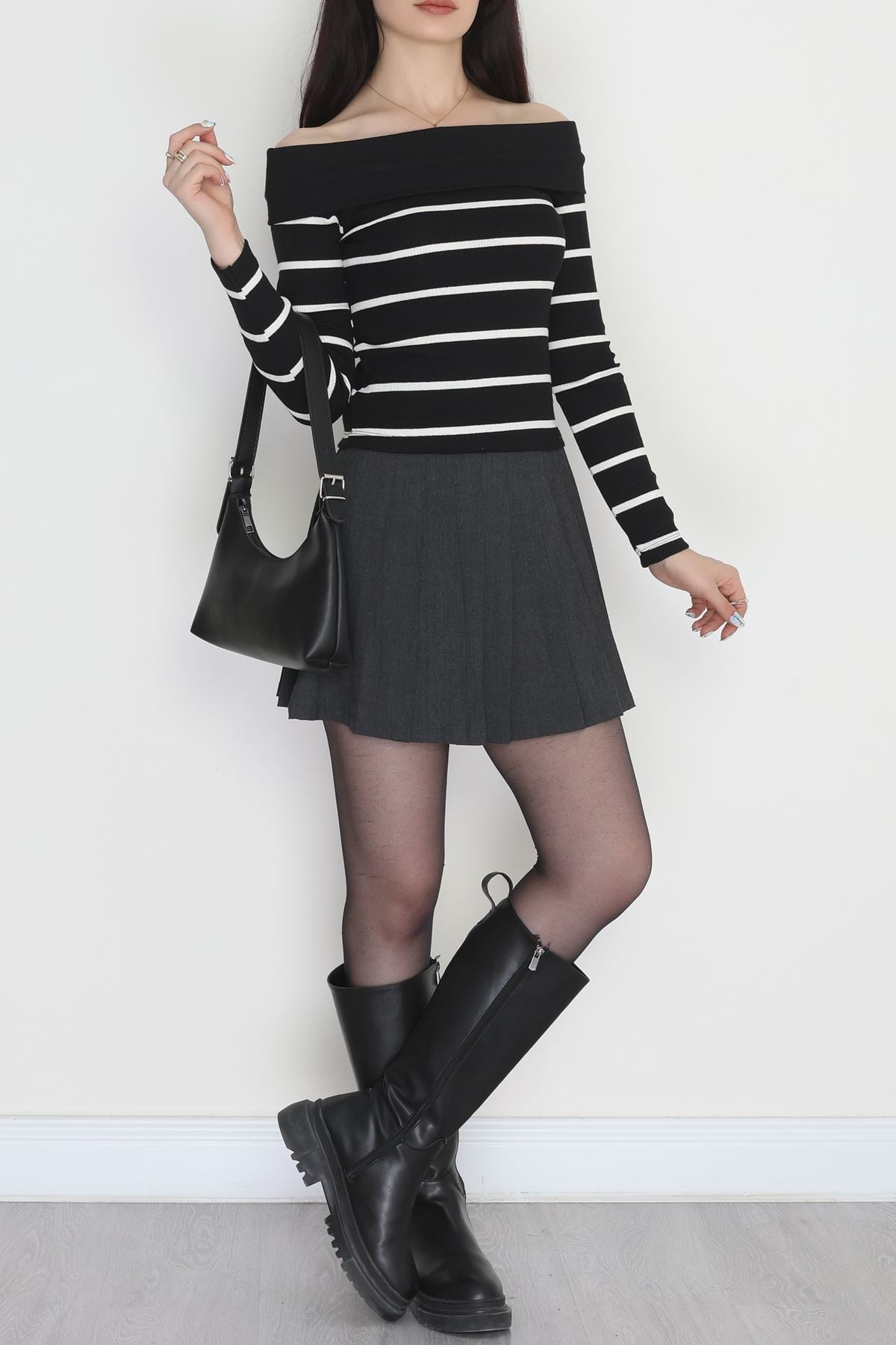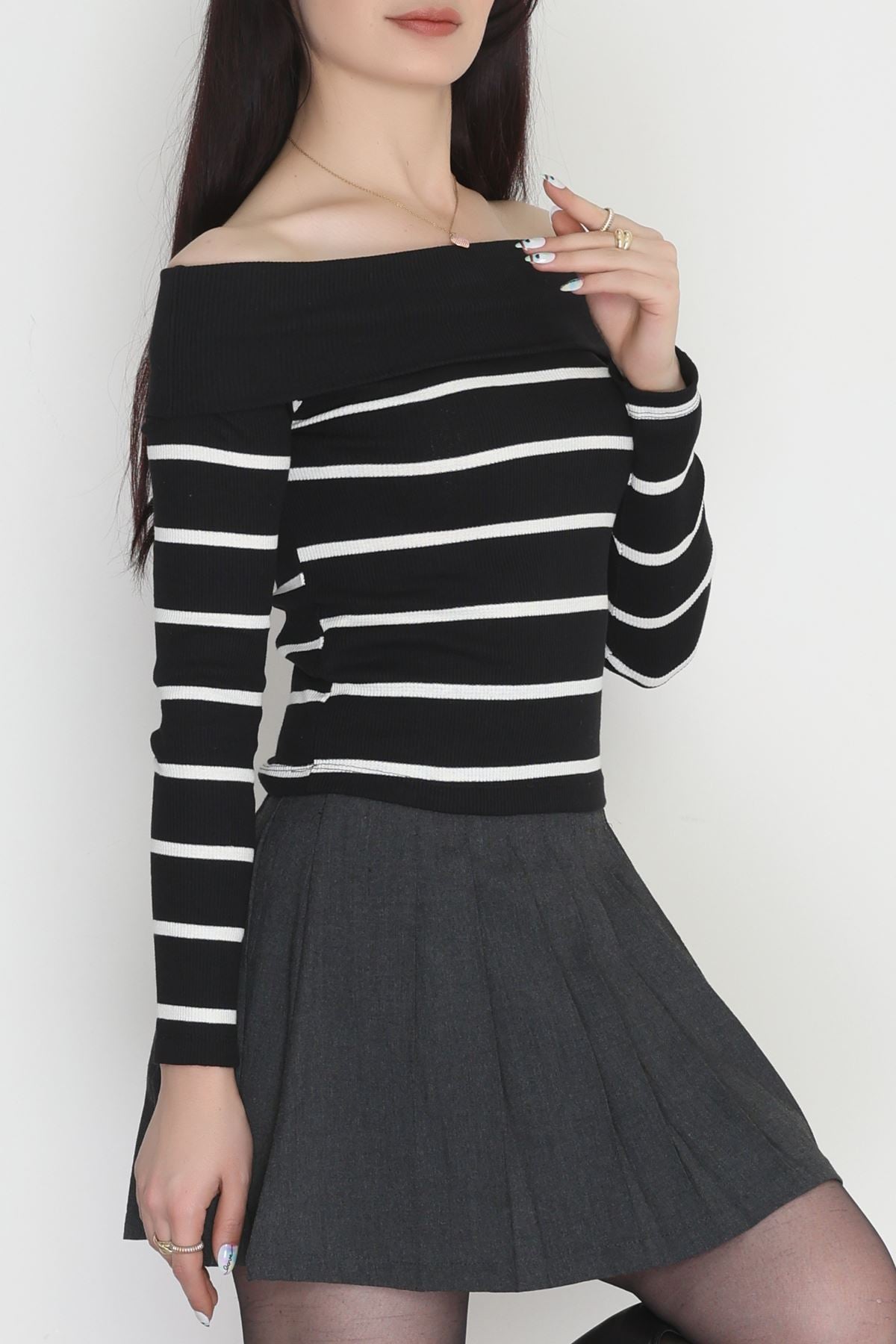 Çizgili Madonna Yaka Likralı Kaşkorse Bluz Siyah - 42619.1748.