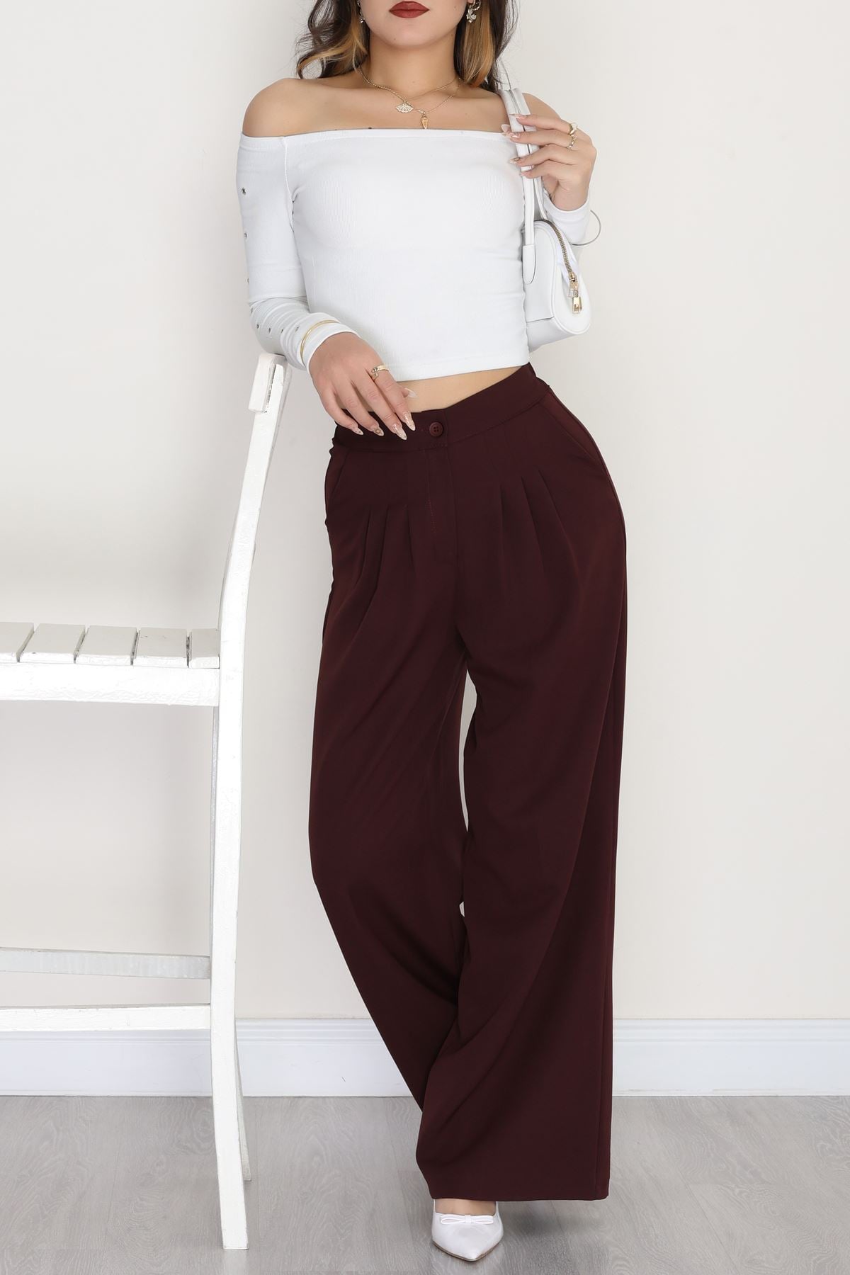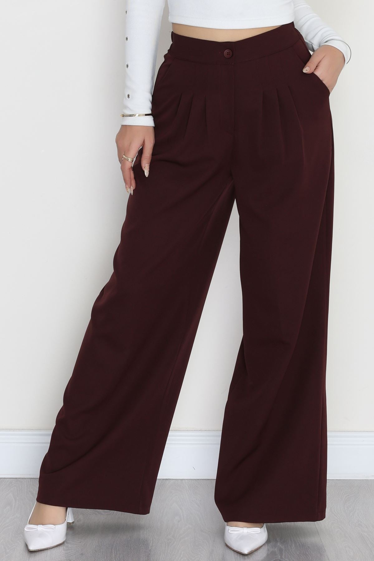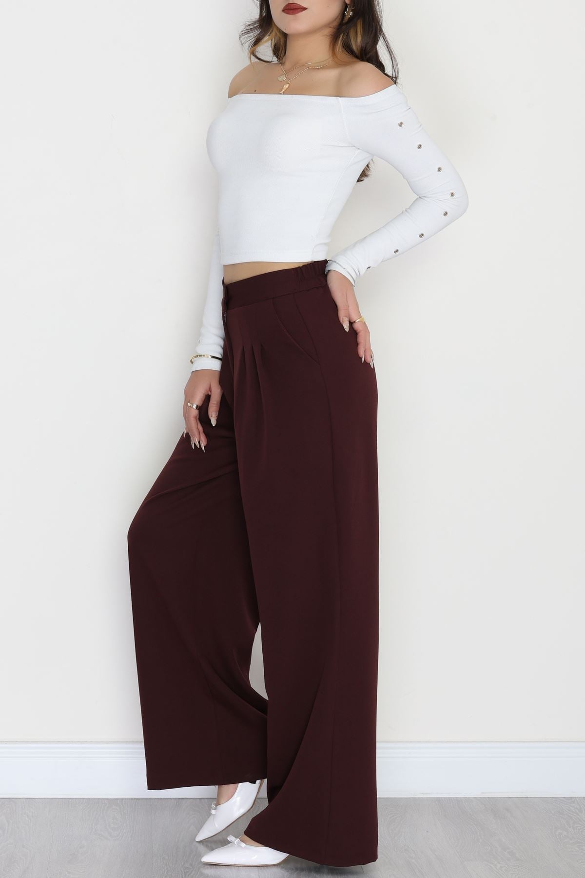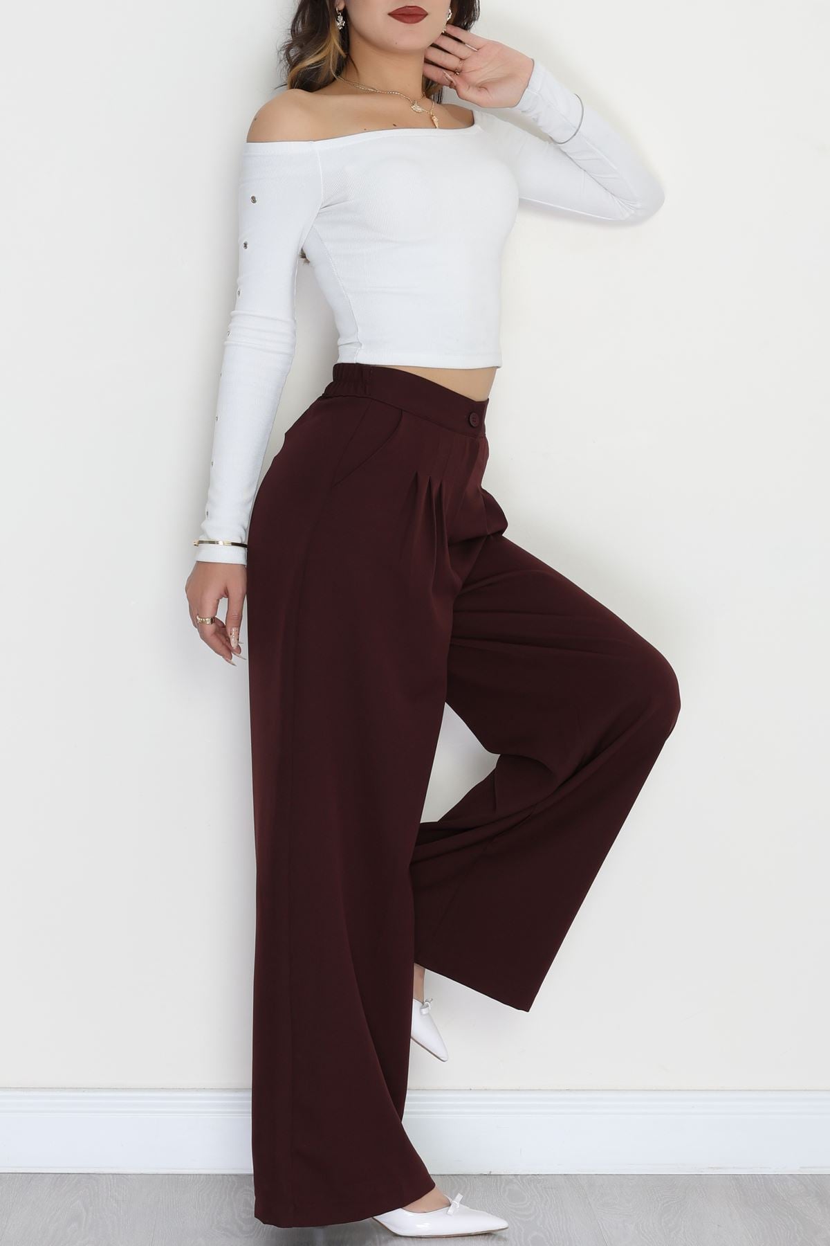 Dabıl Kumaş Beli Lastikli Palazzo Pantolon Mürdüm - 51063.1991.