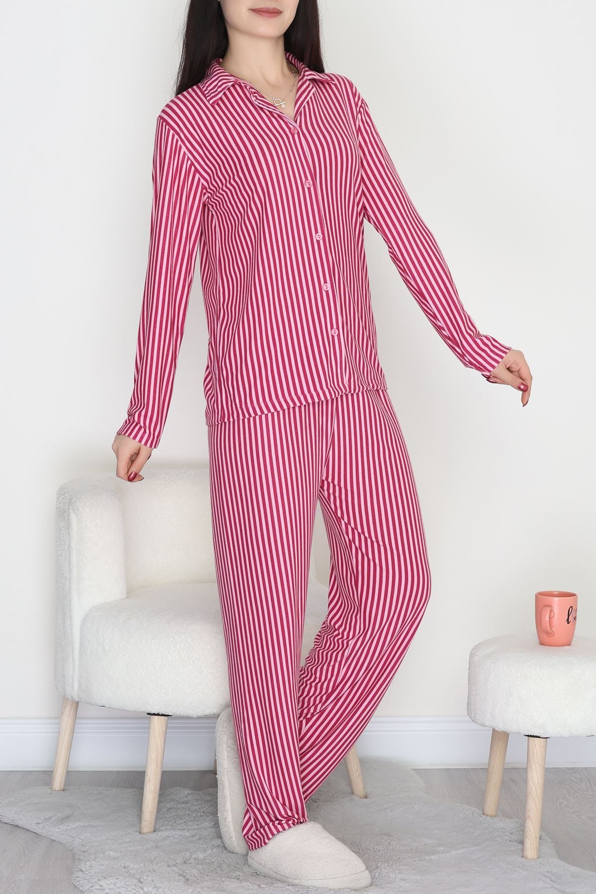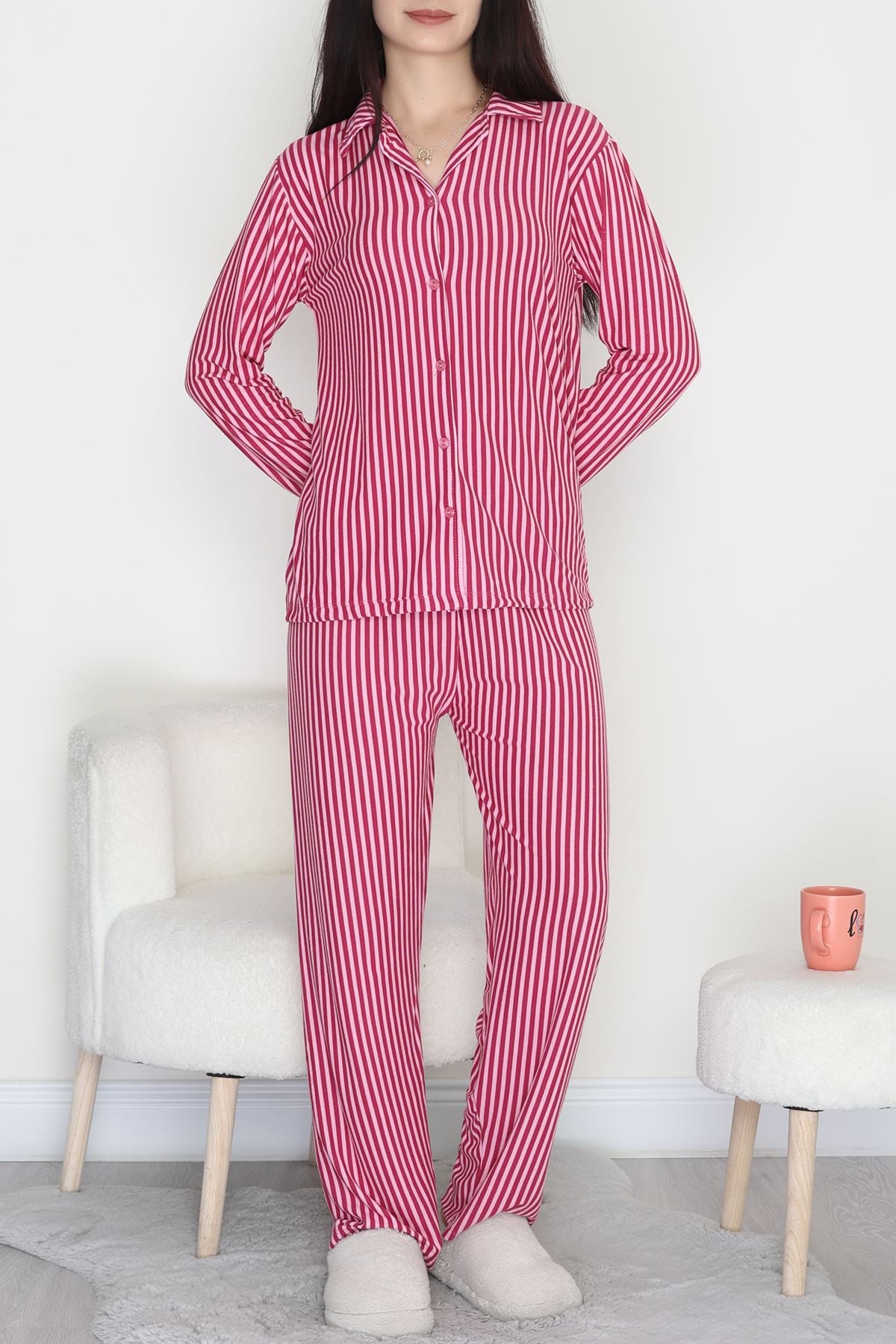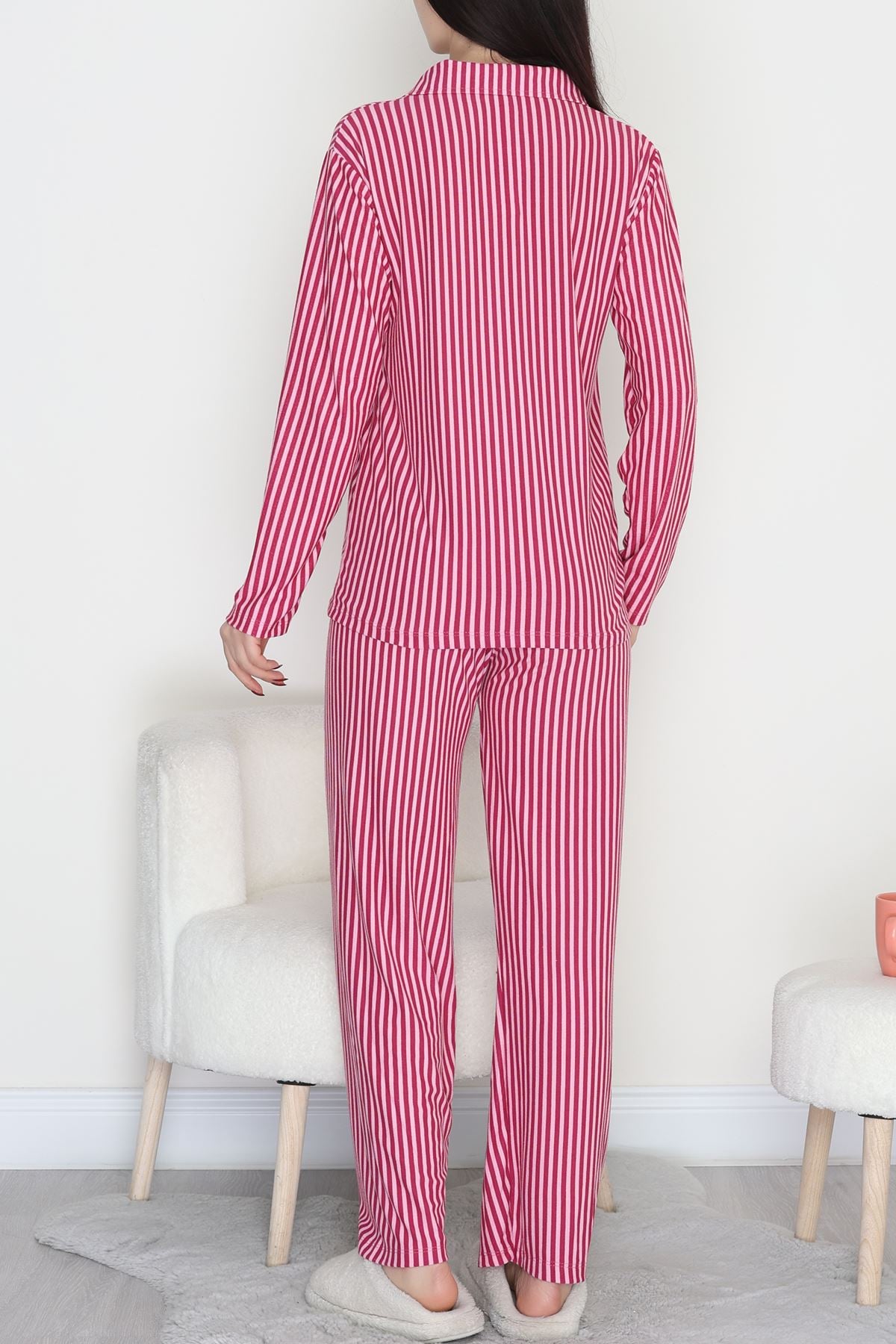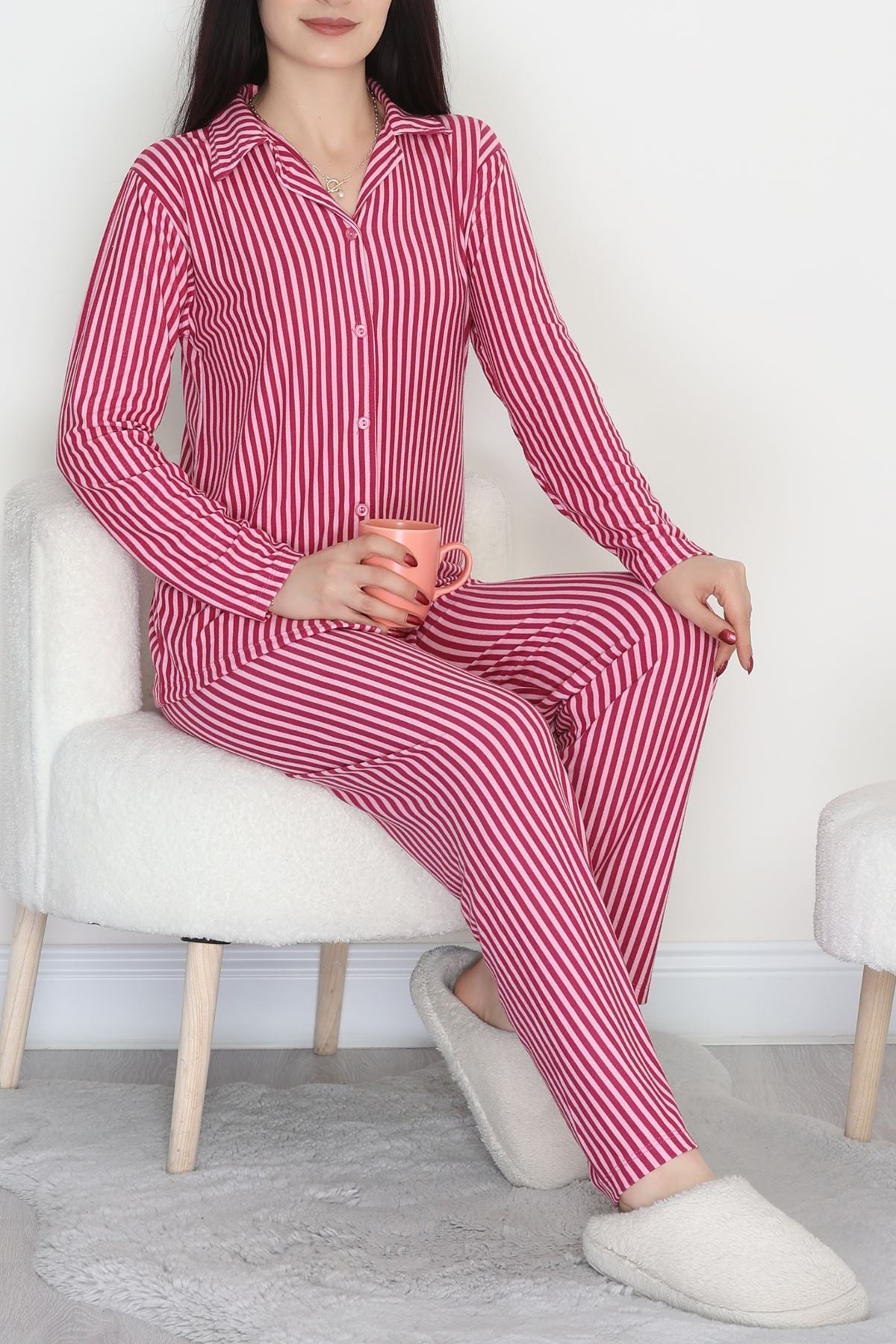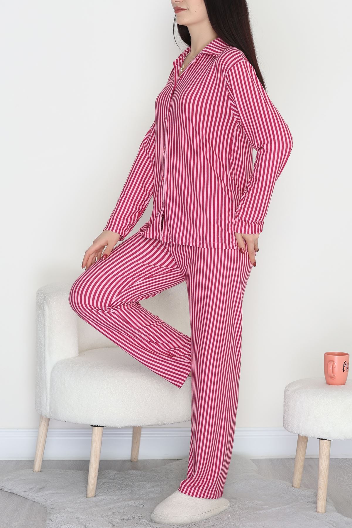 Düğmeli Süet Pijama Takımı Fuşyapembe - 450.1287.