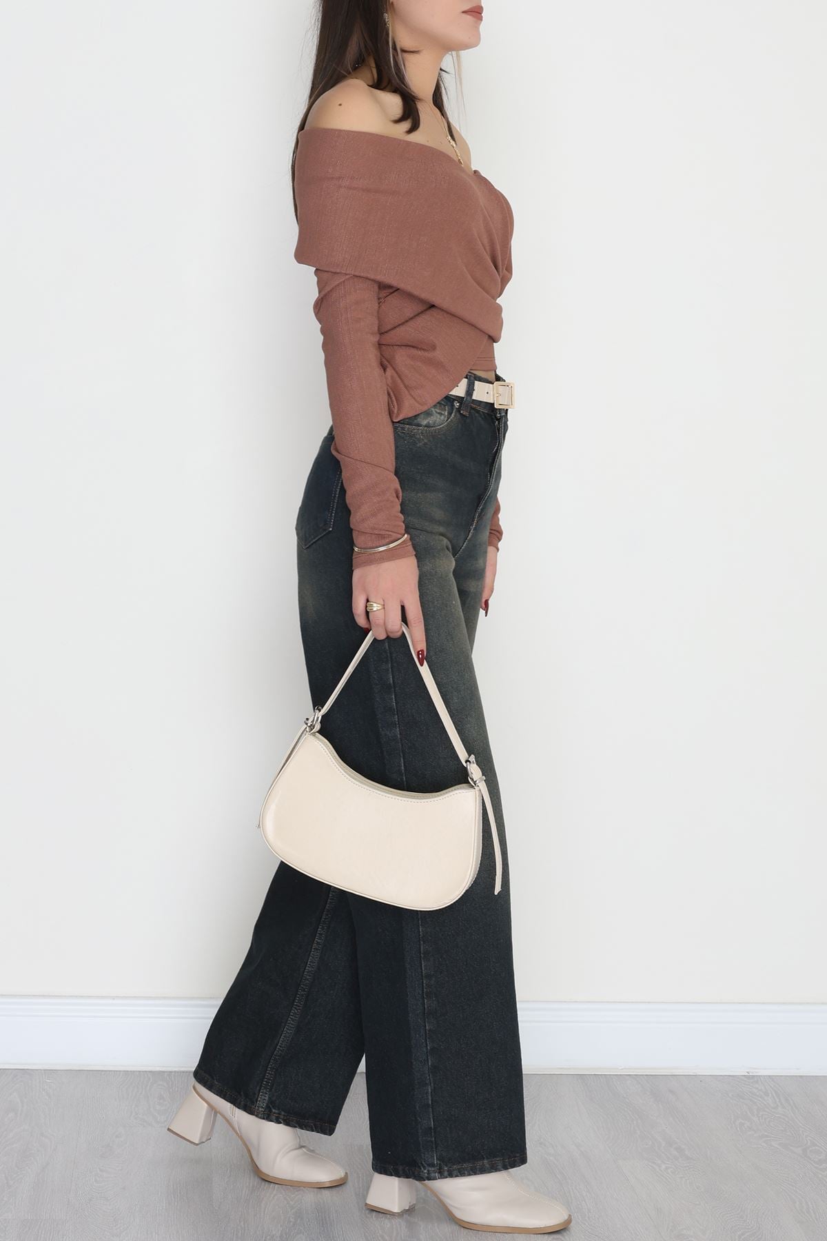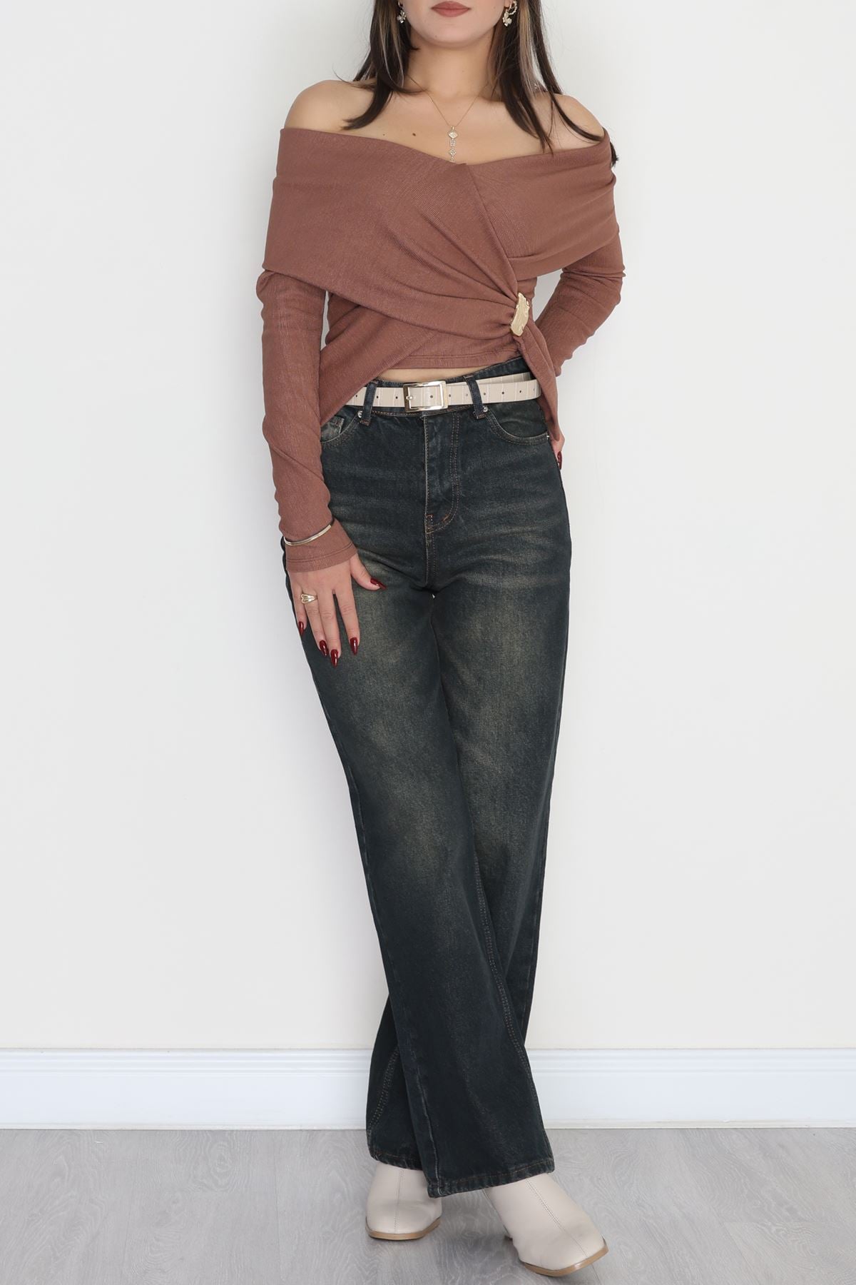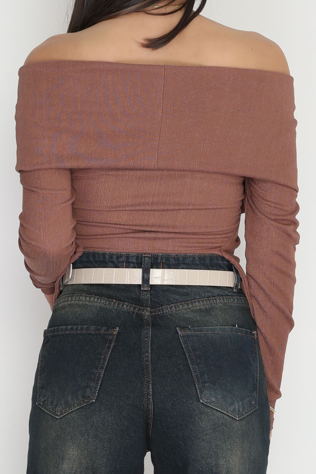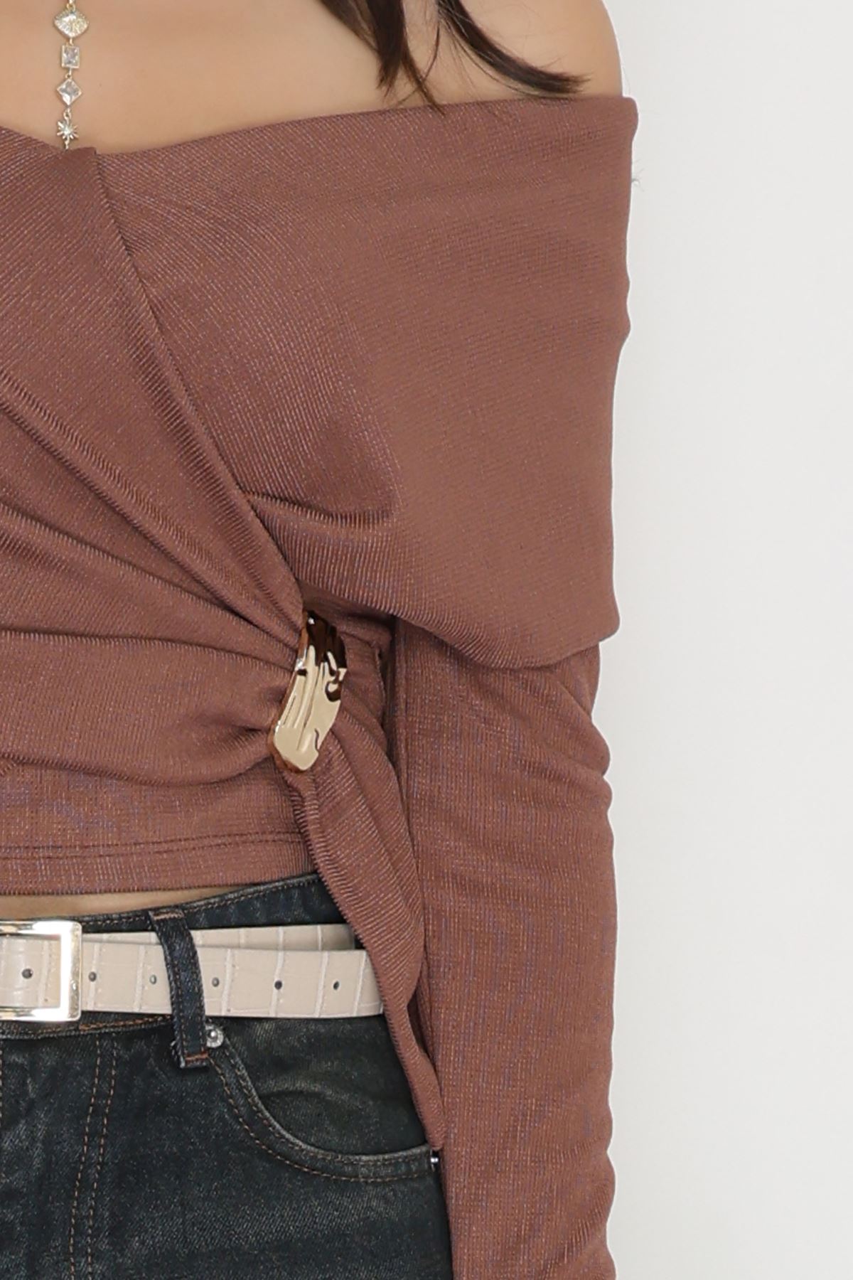 İthal Krep Madonna Yaka Aksesuarlı Bluz Açıkkahve - 70869.148.