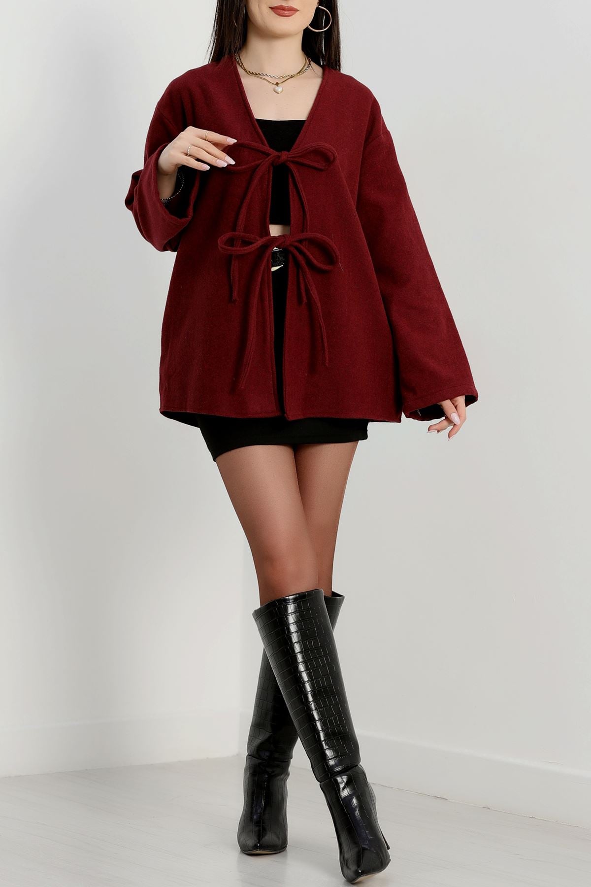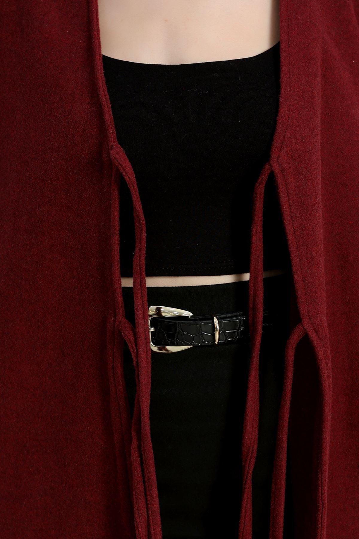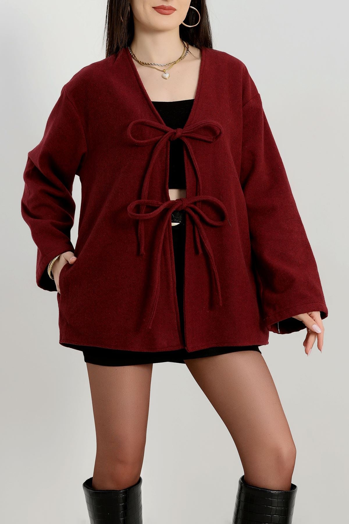 Önü Bağcıklı Kaşe Hırka Bordo - 70995.1775.