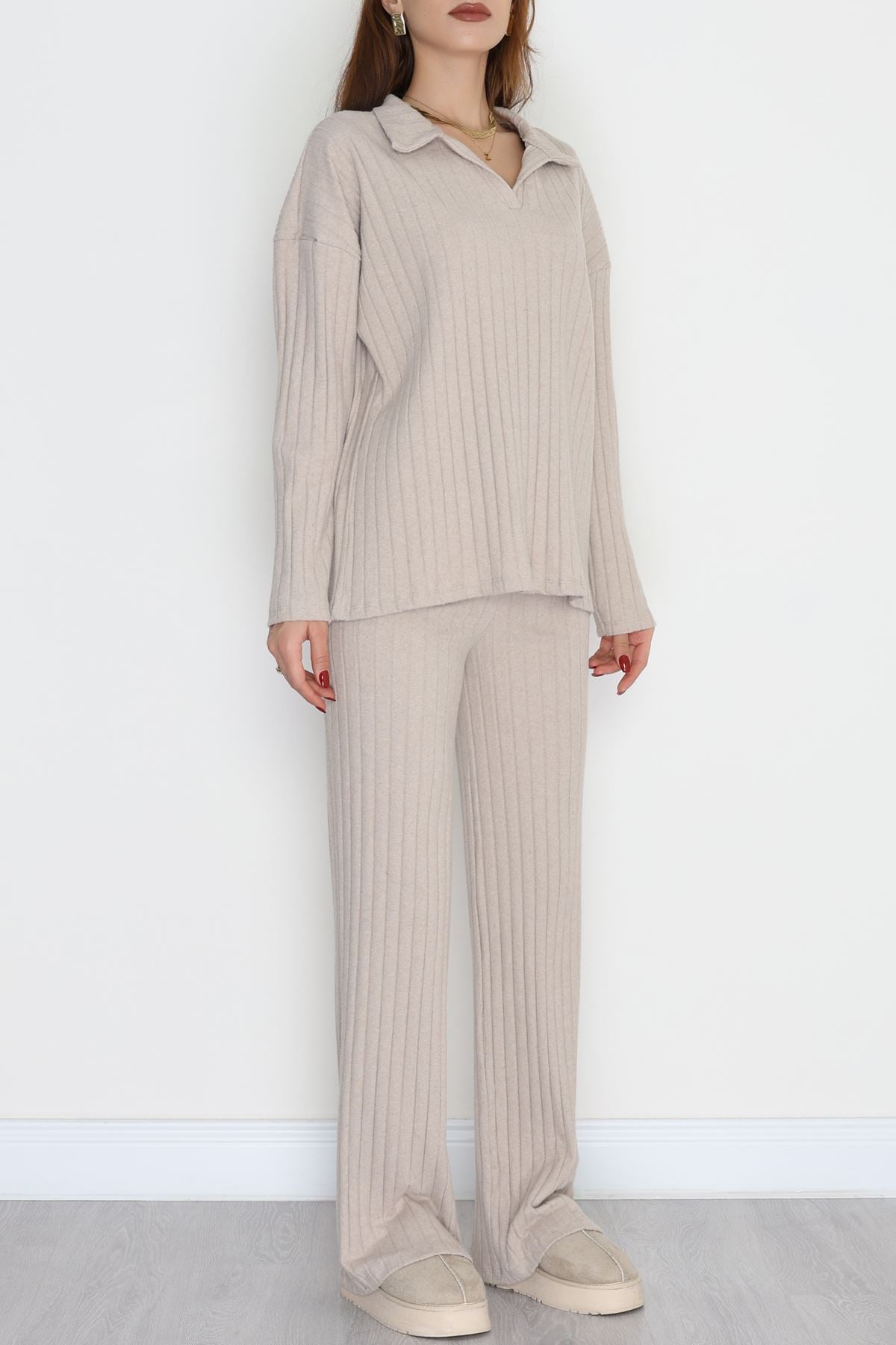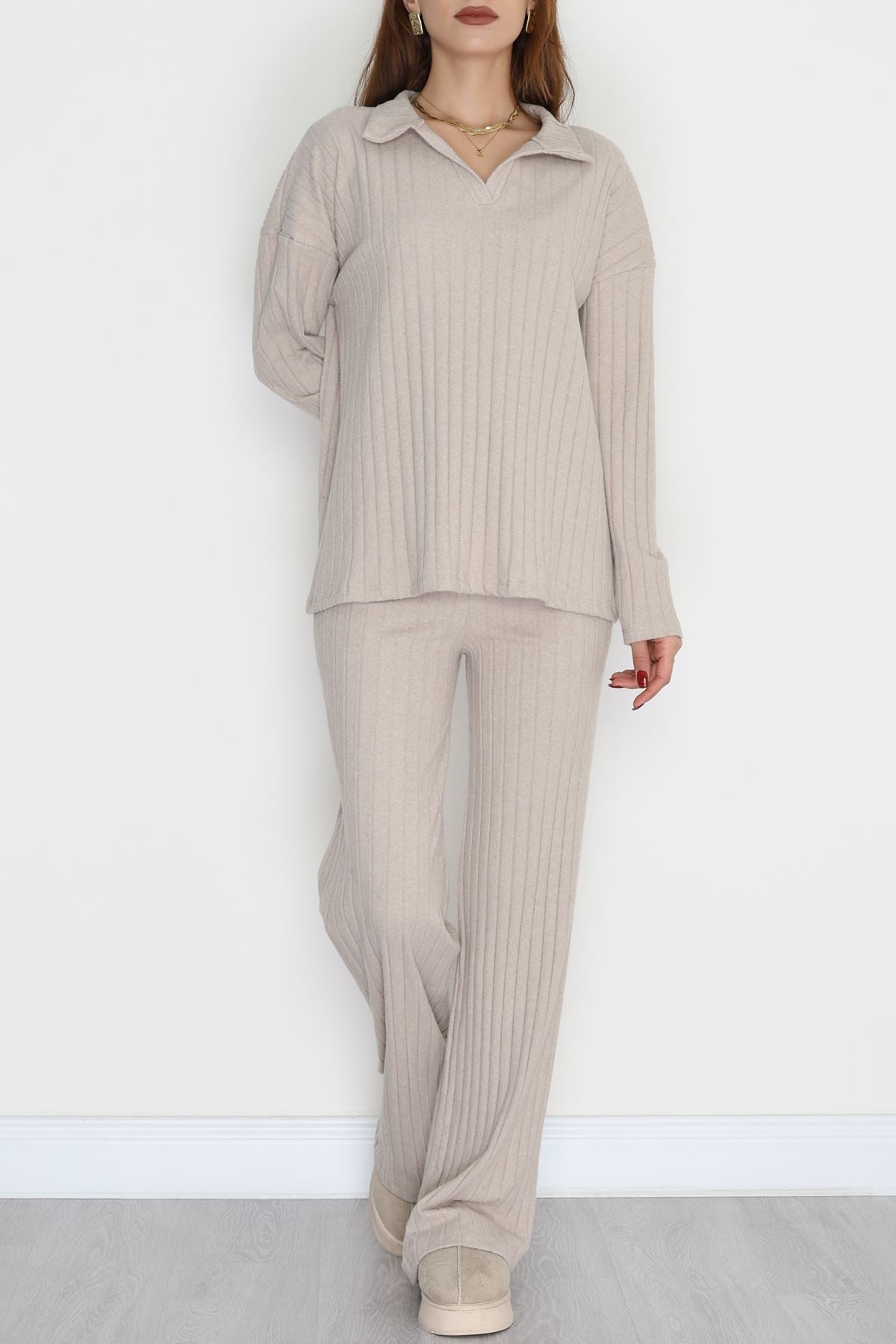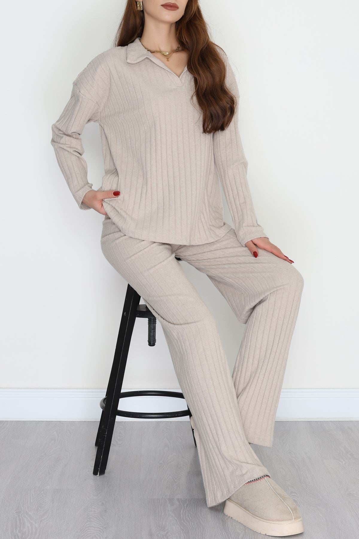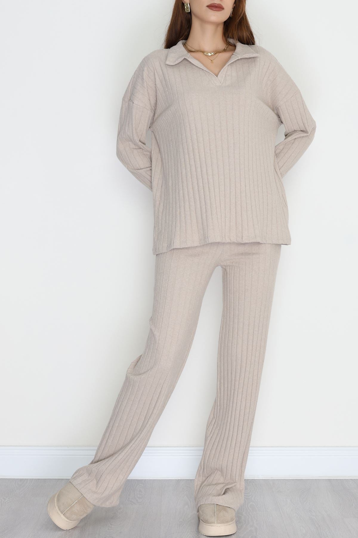 Polo Yaka Likralı İnterlok Fitilli Takım Bej - 90970.1748.