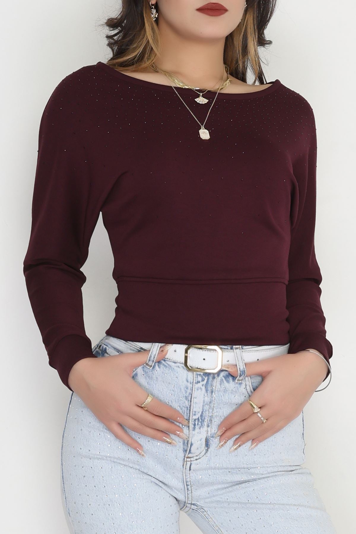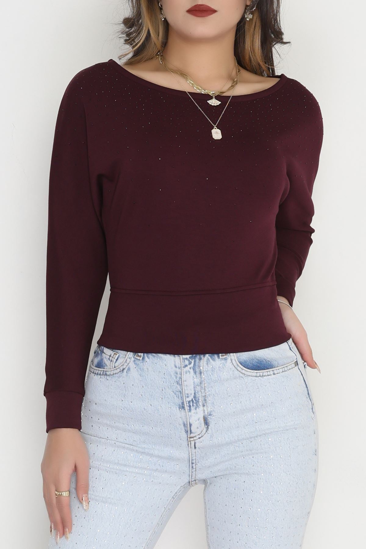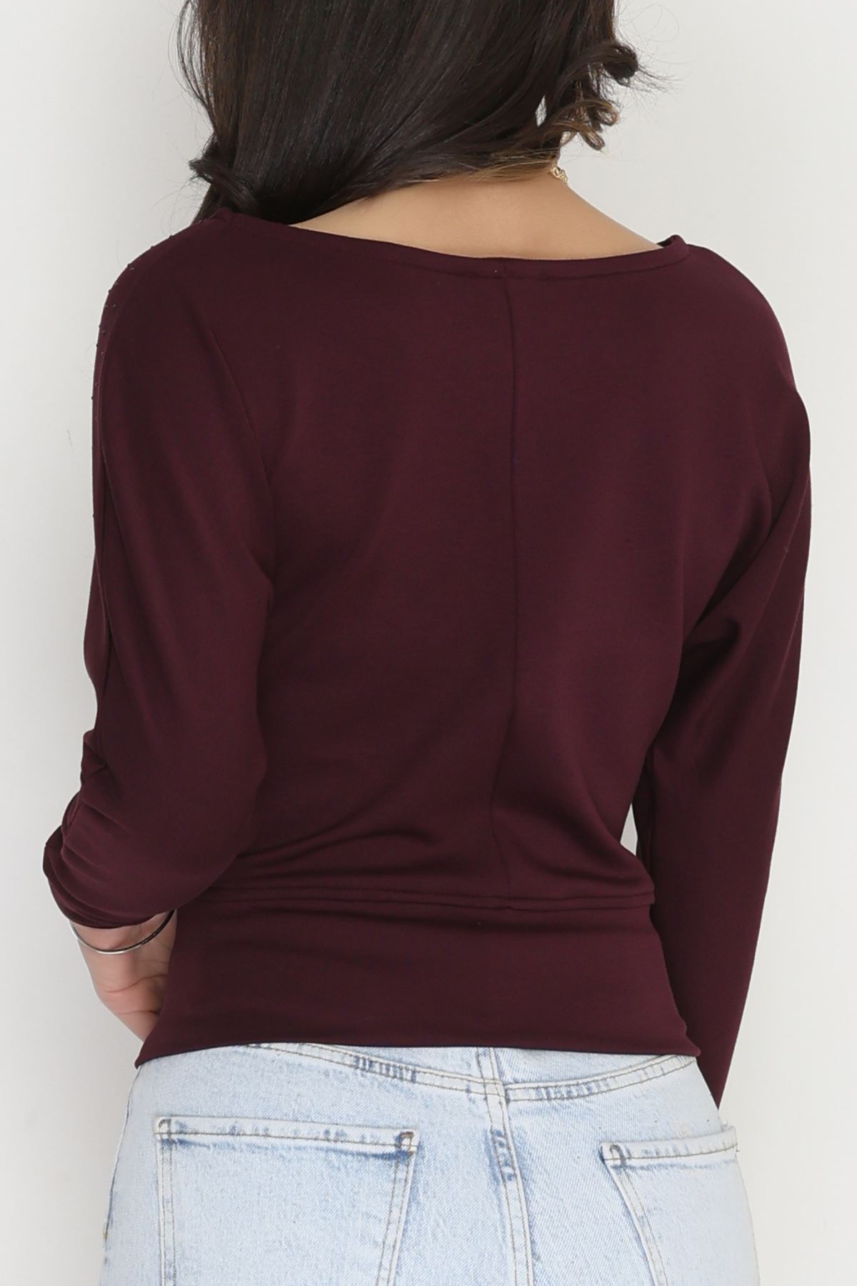 Taş Detay Kayık Yaka Bluz Mürdüm - 4129.1247.