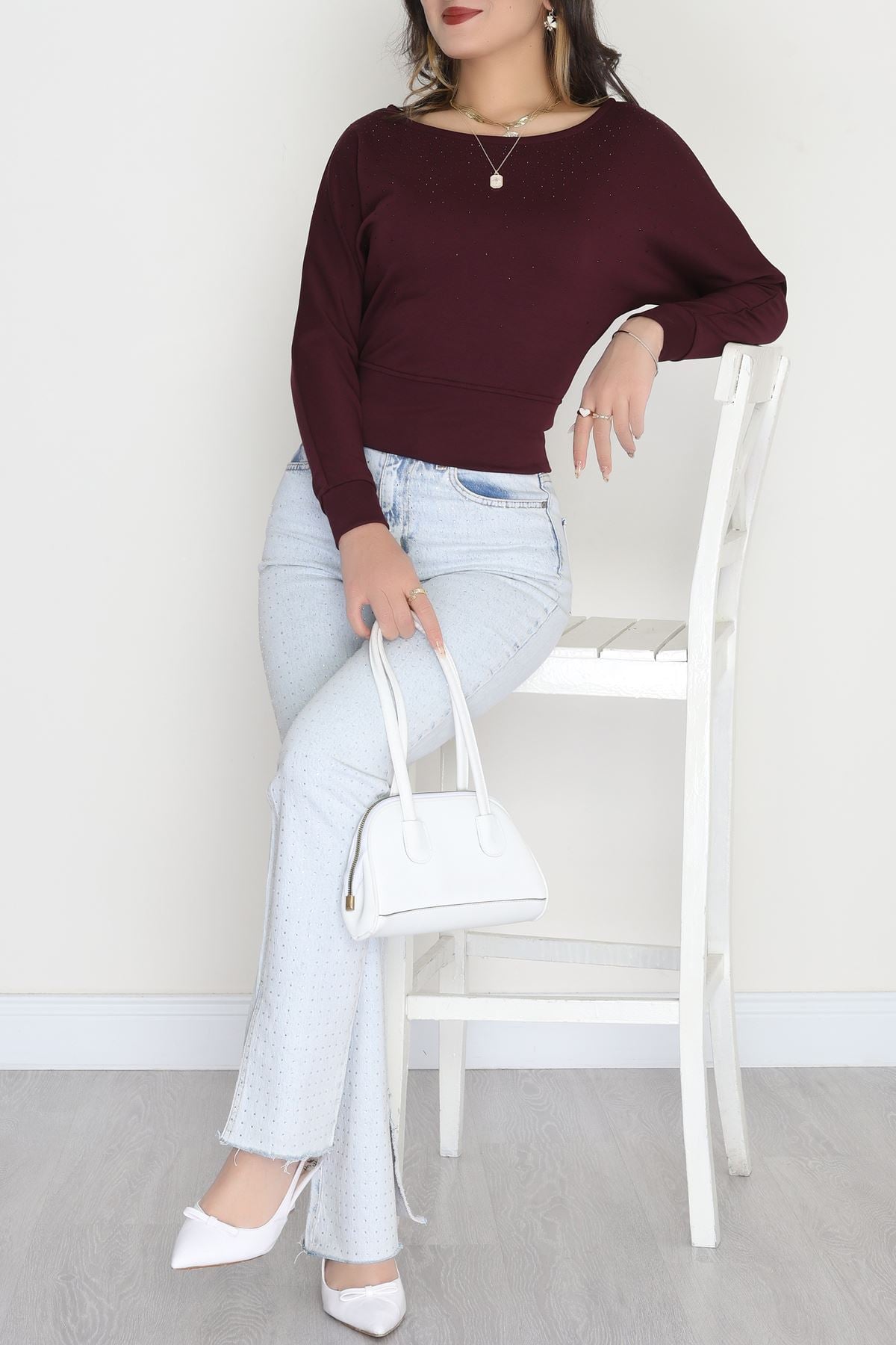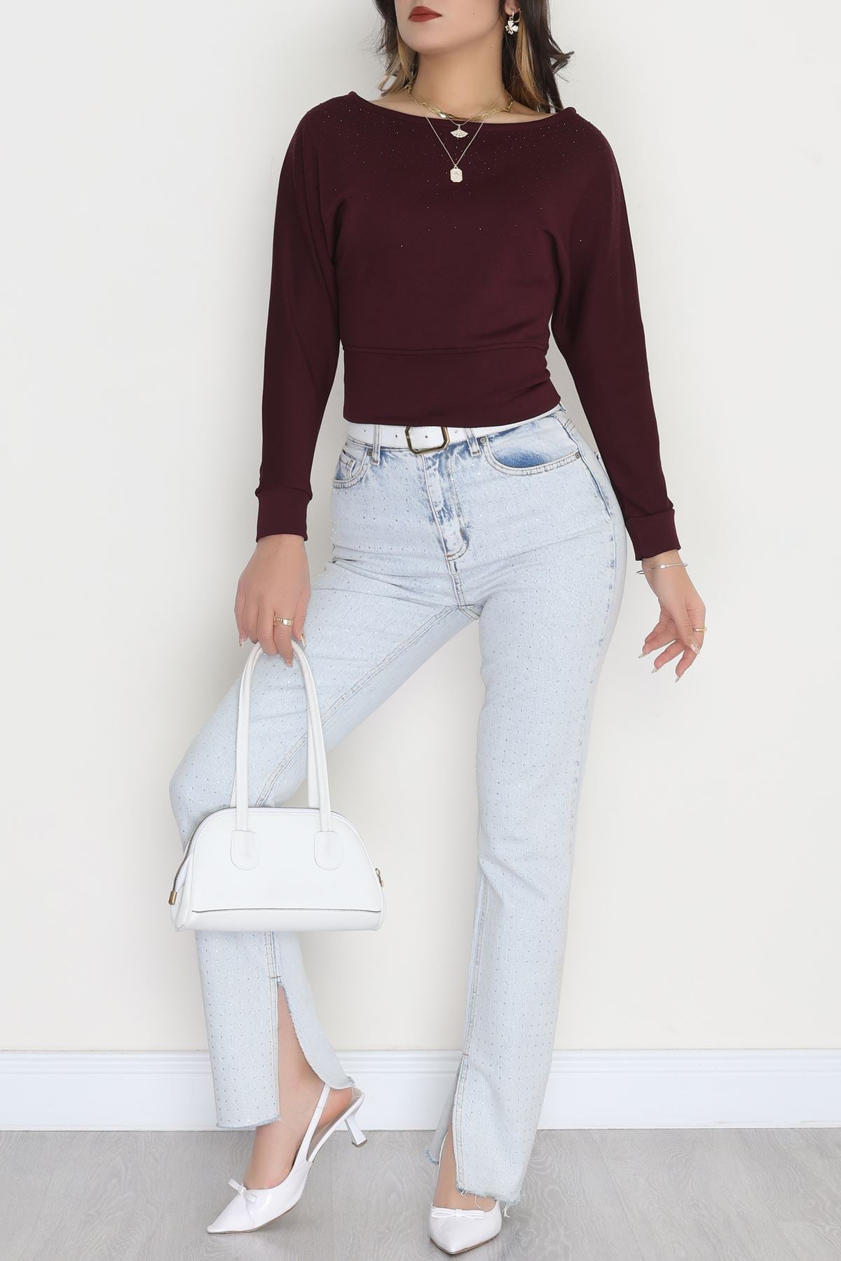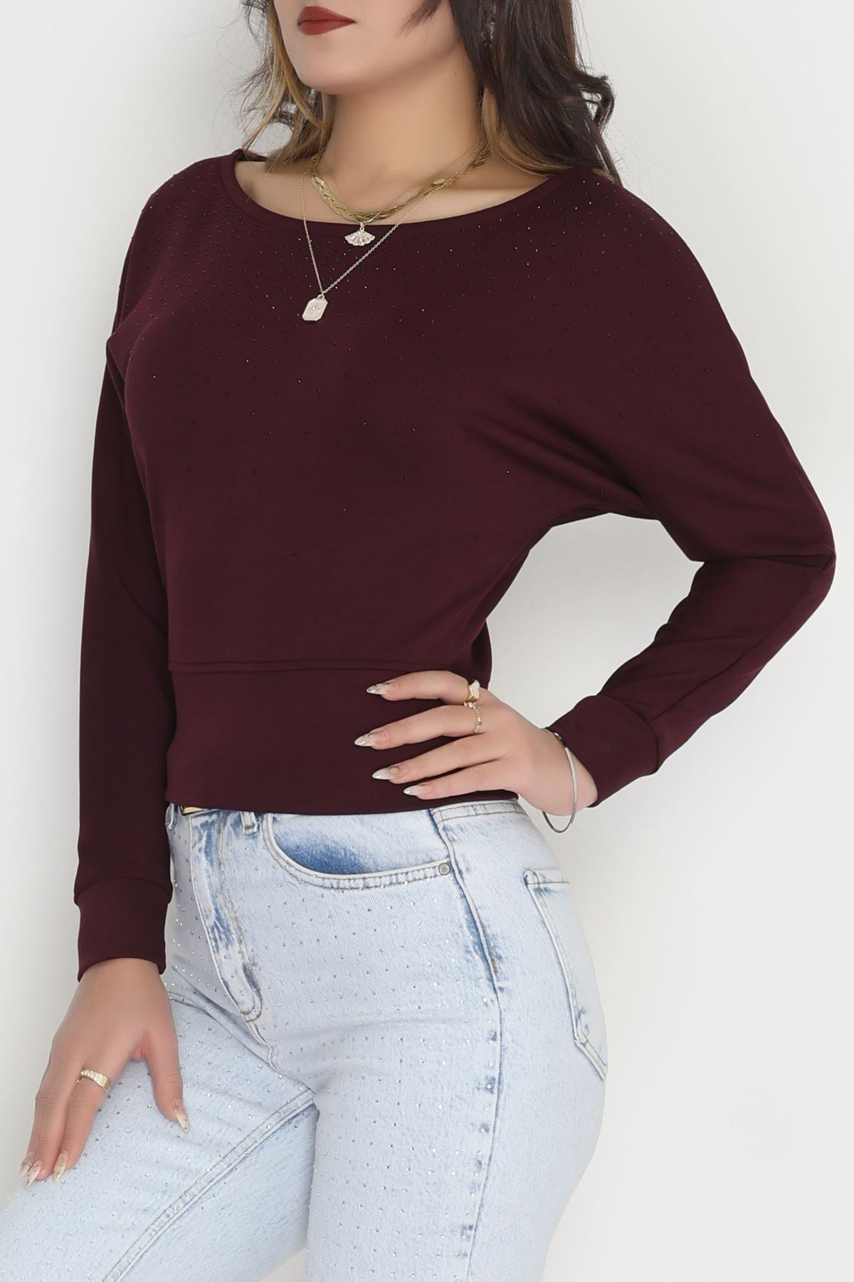 Taş Detay Kayık Yaka Bluz Mürdüm - 4129.1247.