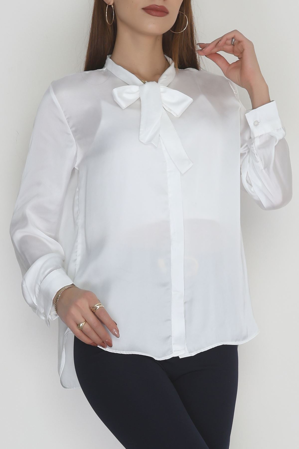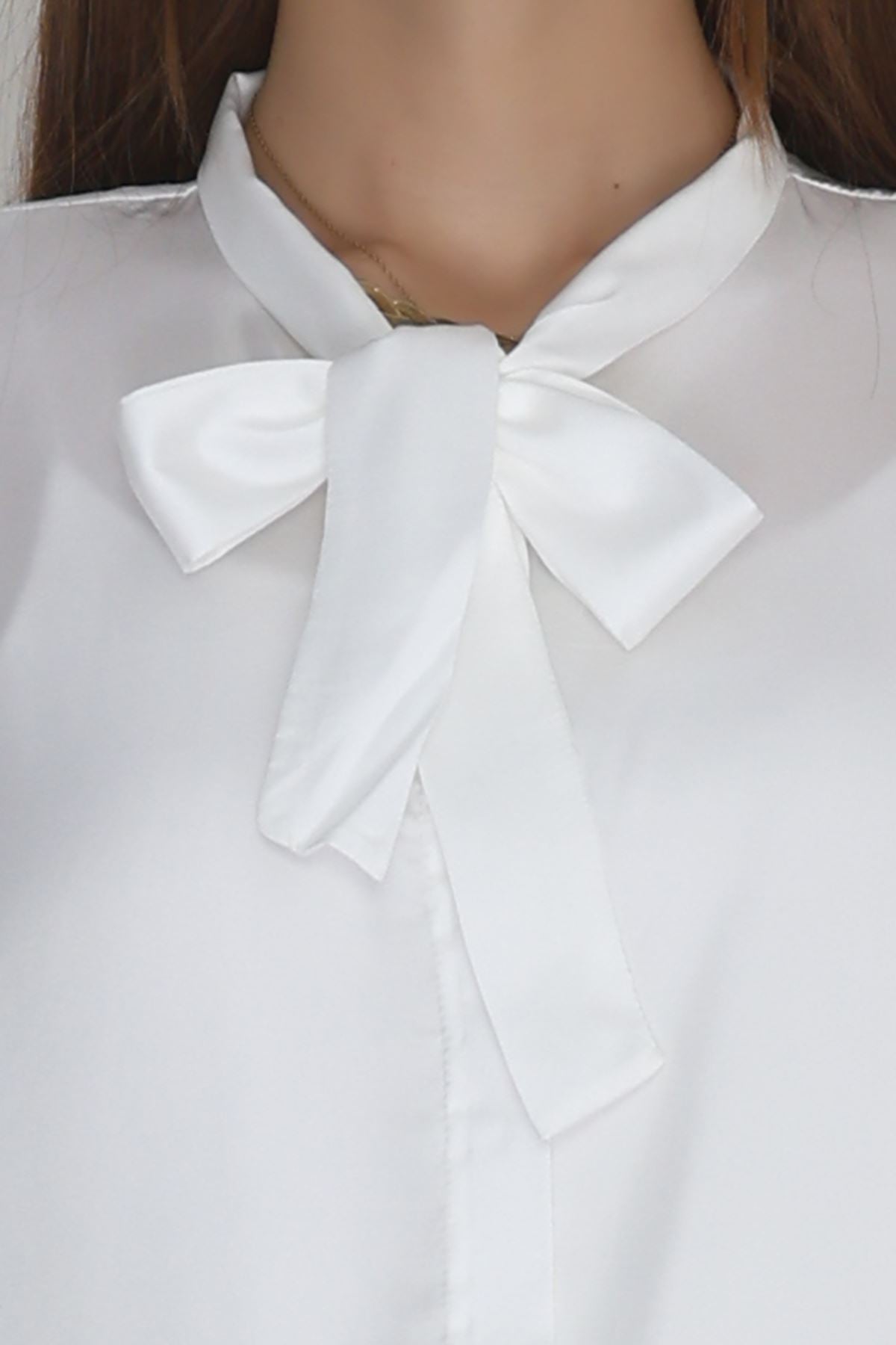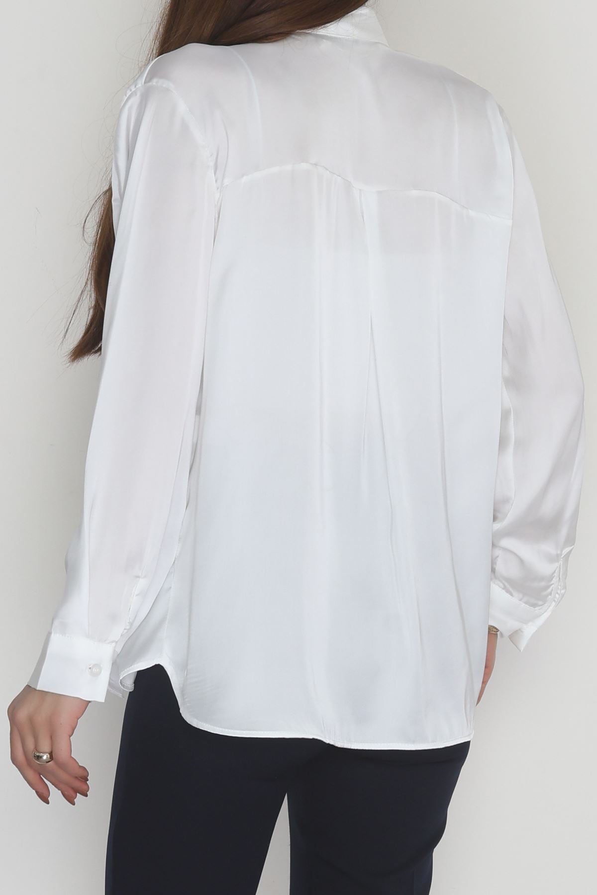 Yaka Bağlamalı Saten Gömlek Beyaz - 20002.1595.