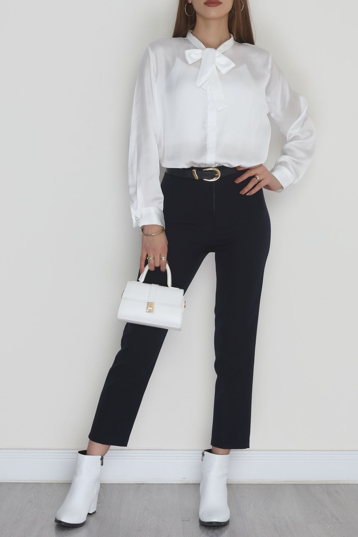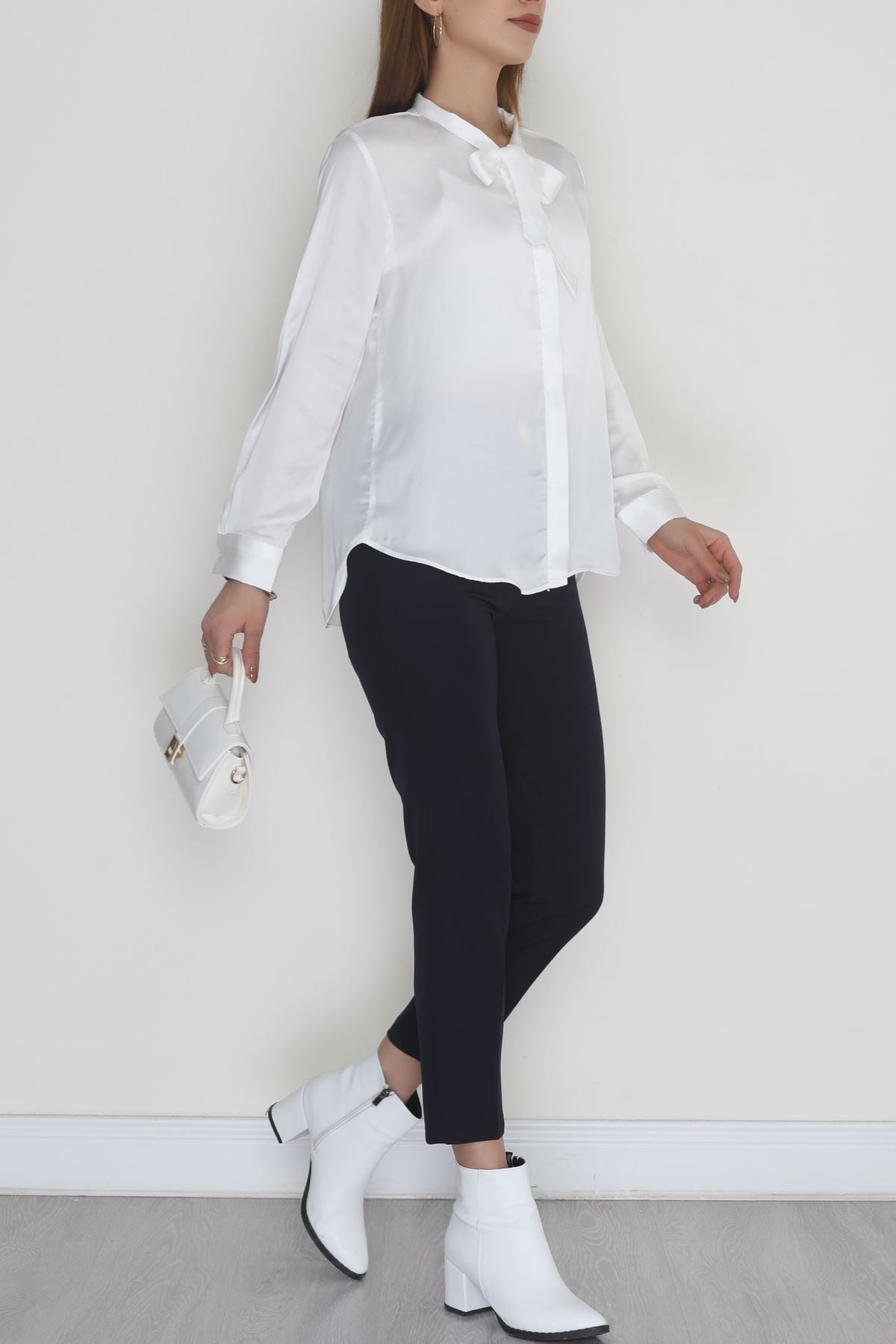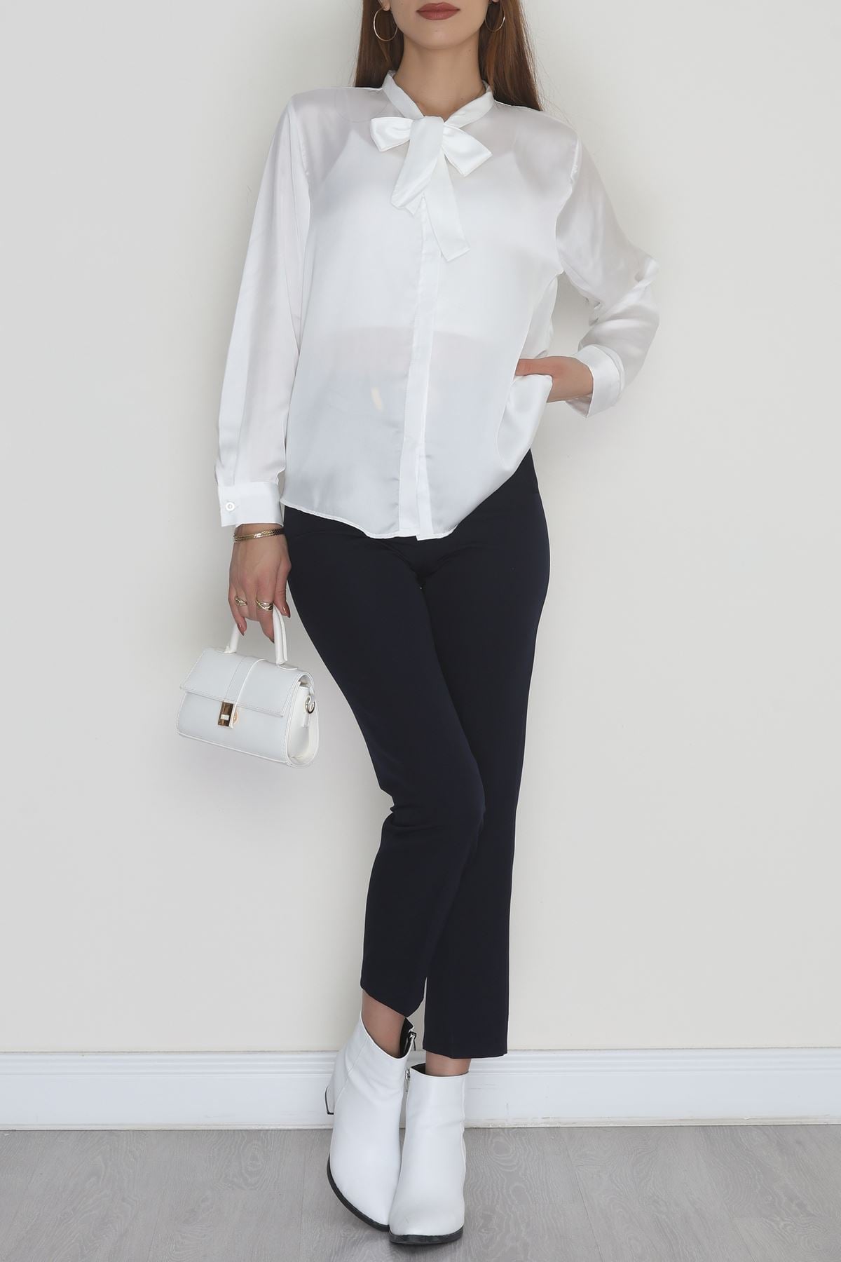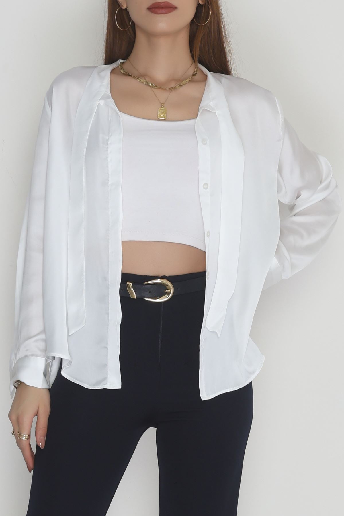 Yaka Bağlamalı Saten Gömlek Beyaz - 20002.1595.